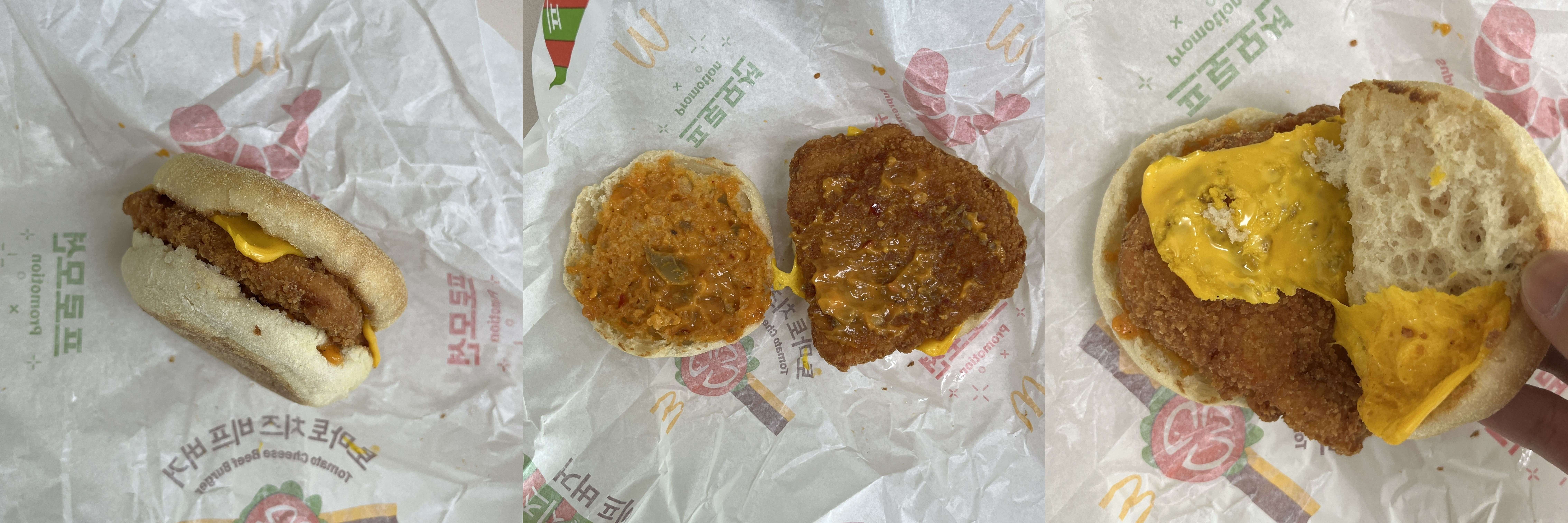 뜯어보면 딱 이런 느낌. 겉으로 봤을 땐 기존 치킨 치즈 머핀과 별 차이점을 모르겠다. 그런데 약간 가까이 가면 약간 매콤한 향이 나서 투움바 소스라는 걸 알 수 있다. 한쪽면에는 기존과 동일하게 치킨 패티 위에 치즈가 있고, 다른 면에 이제 투움바 소스가 있다. 뜯어보니 비주얼은 조금 그렇기는 하다.