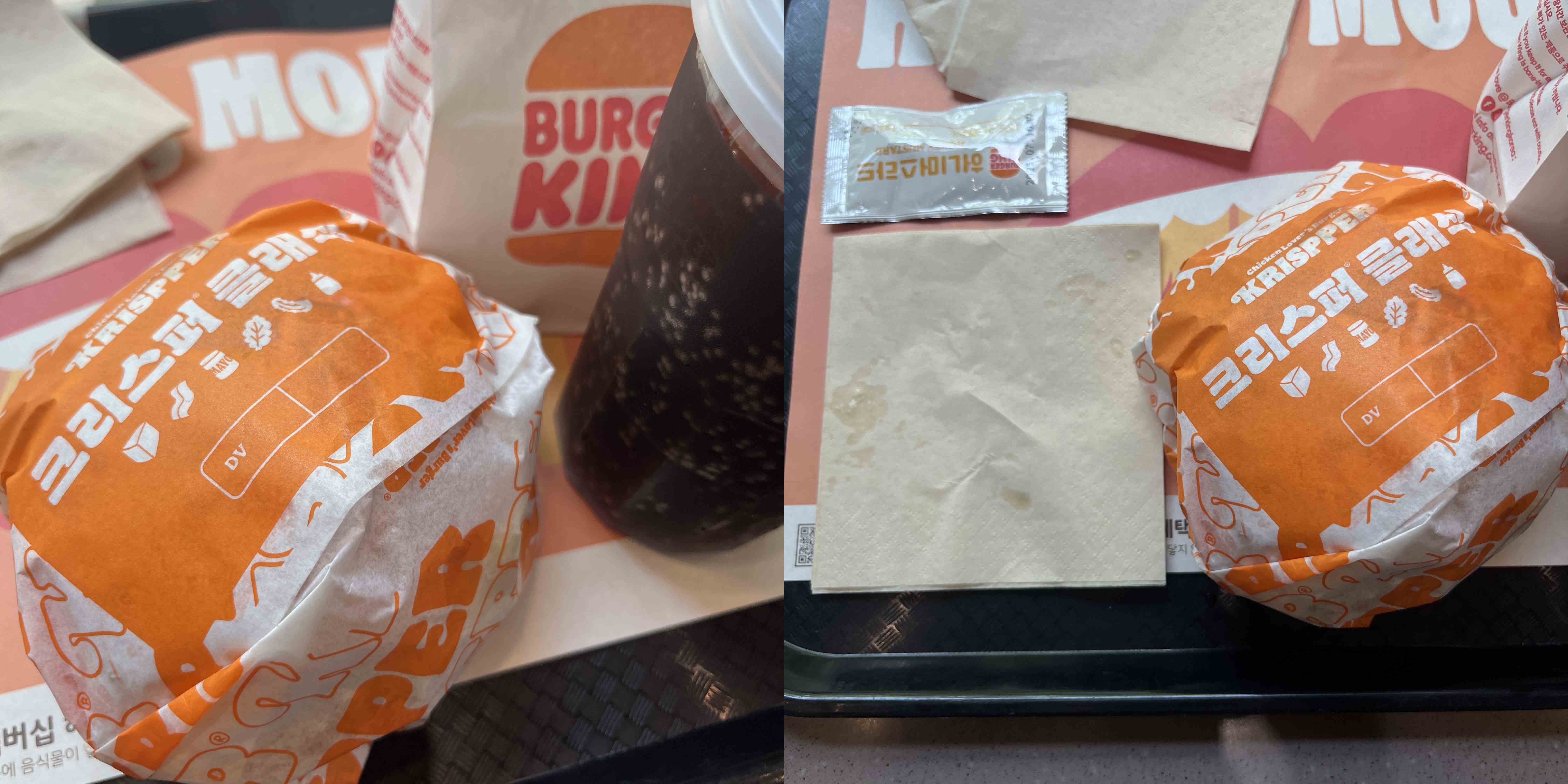 얼마 전에 나온 버거킹의 치킨버거 신메뉴로 치킨킹과는 사뭇 다른 비주얼을 보이고 있다. 나는 버거킹 크리스피 클래식 세트로 먹었고 감자튀김 대신 너겟으로 먹었다. 크기는 같이 주는 휴지 크기를 비슷하다.