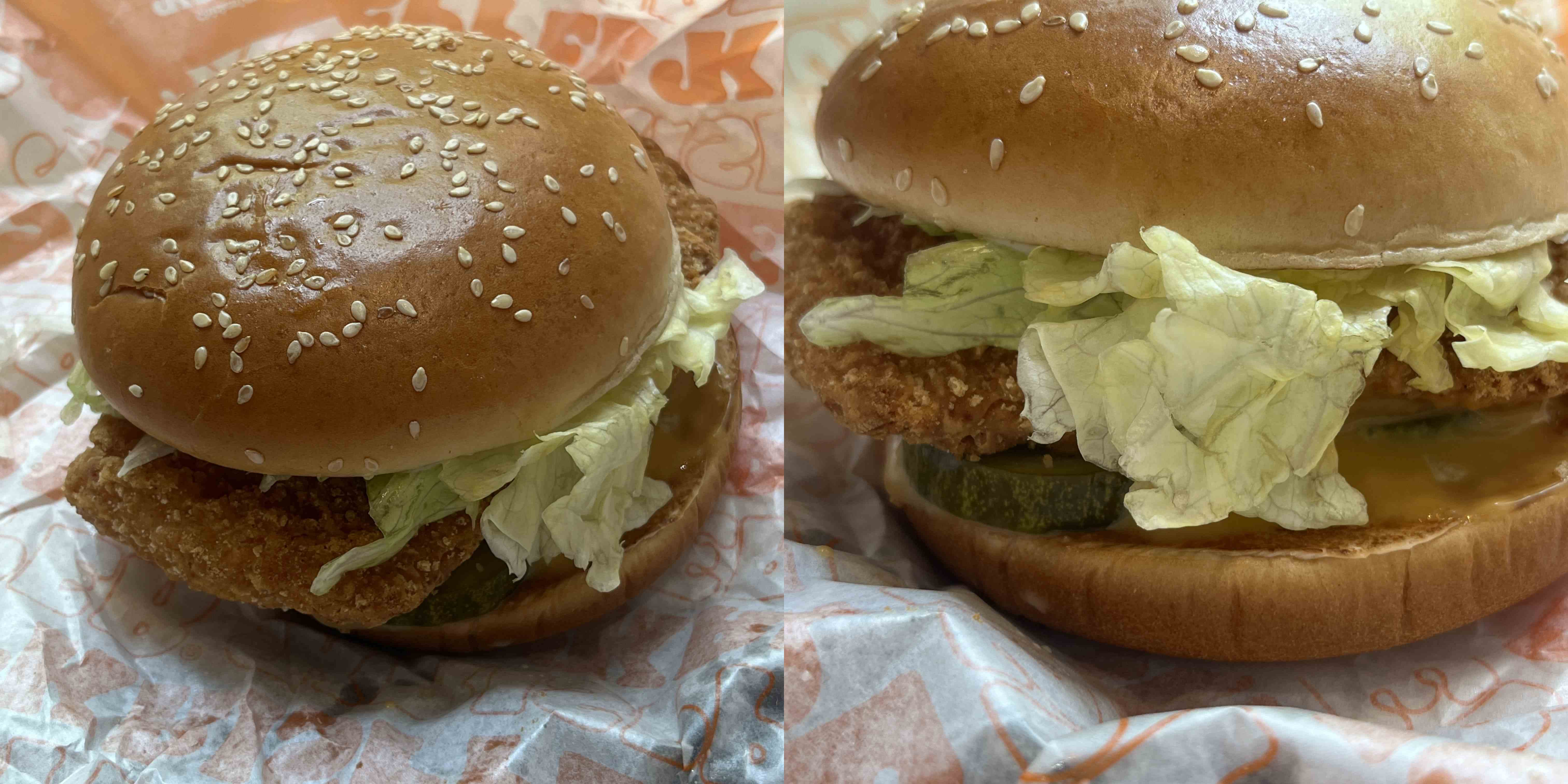 치킨 패티는 맥도날드 상하이 스파이시 버거처럼 쌀가루 튀김을 입혀 더욱 바삭함을 살렸다고 한다. 개인적으로 아쉬운 부분은 약간 개체 차이인지 모르겠으나 치킨 패티가 좀 두툼하지 않았다는 점.