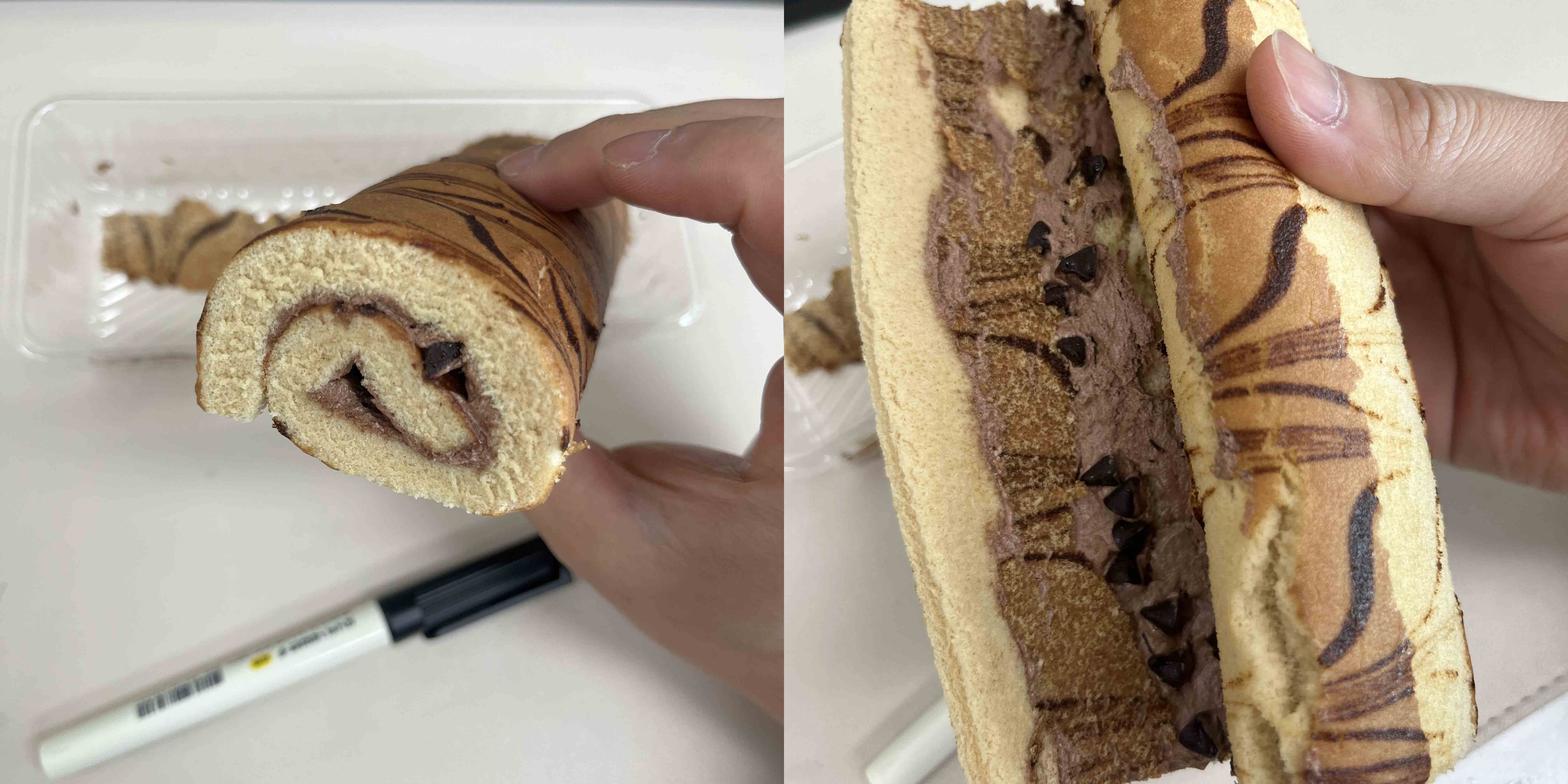 단면은 저렇게 생겼다. 그냥 기다란 빵에 초코칩과 크림을 바르고 돌돌 말아줘서 완성된 빵이다. 맛은 포켓몬빵에 로켓단 초코롤이나 고오스빵에 들어간 초코크림 딱 그 맛으로 무난하게 먹을 수 있는 맛.