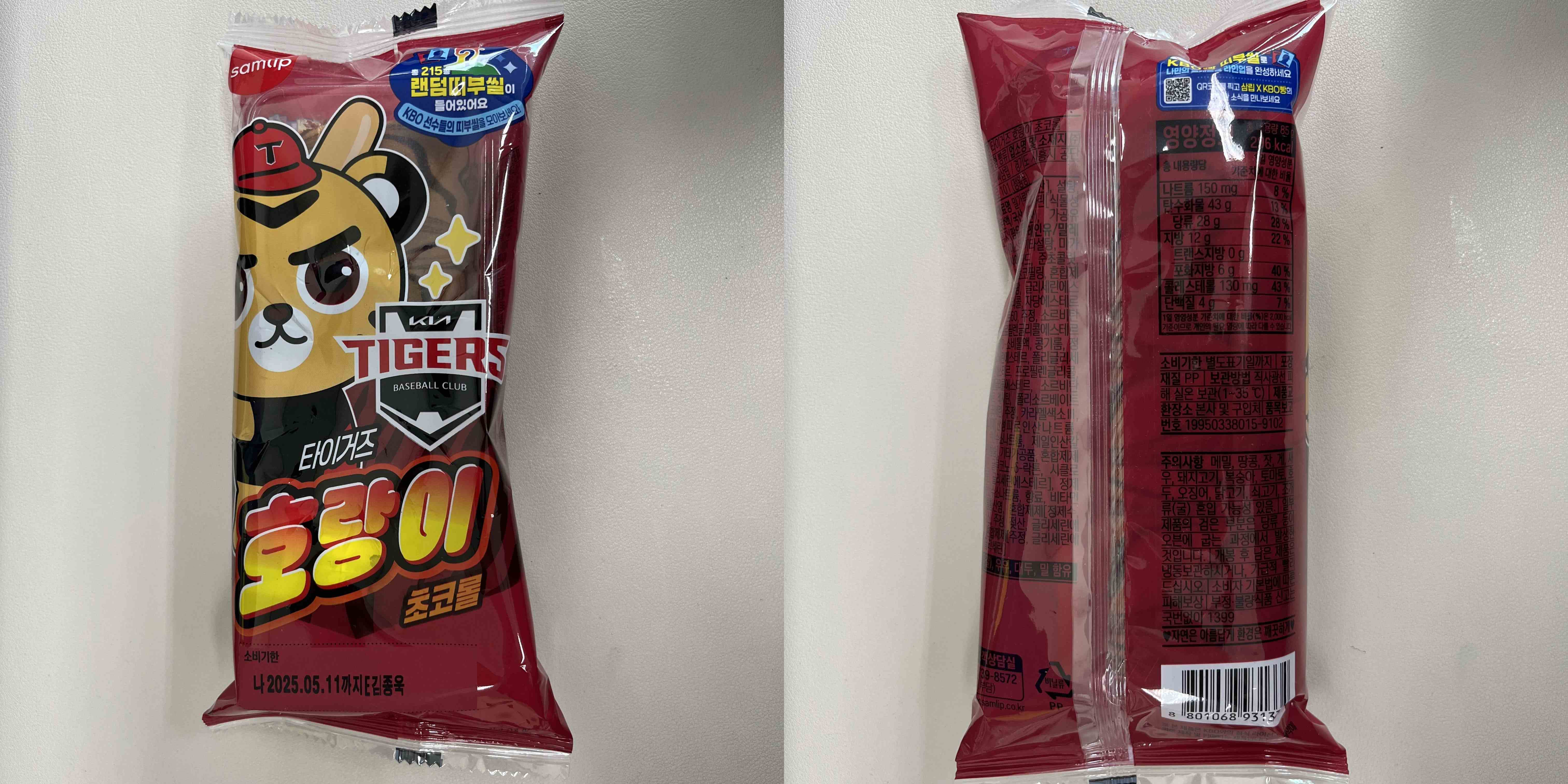 요즘에는 야구 시즌이라 그런지 포켓몬 빵은 점차 안 보이고 크보빵만 보인다. 군것질할 거 사러 갔다가 마침 기아 타이거즈 초코롤 빵이 보이길래 샀다. 두산 베어스에 꿀빵은 이미 먹어봤고 다른 것보다 맛이 가장 무난할 것 같아서 구매했다. 콜레스테롤 비율이 상당히 높은 수준이다.