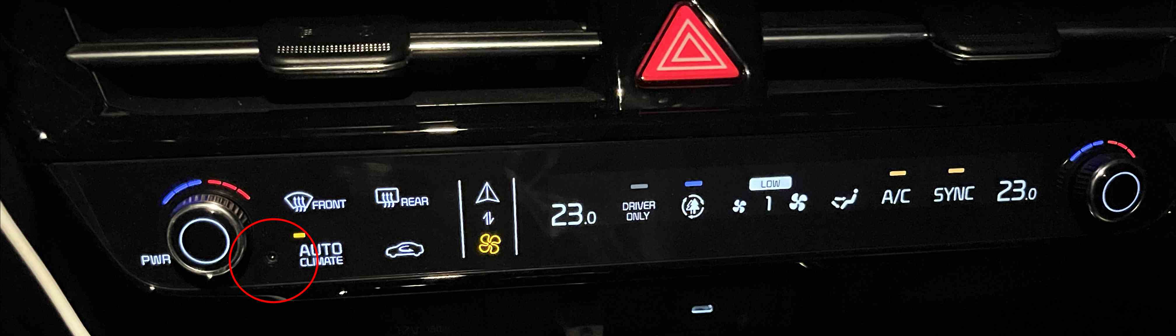 검색을 해보니까 이럴땐 그냥 한번 재부팅하면 된다고 하길래 재부팅을 해봤다. 차량마다 재부팅 버튼은 다르지만, 기아 니로 하이브리드의 경우 운전석 에어컨 조절 옆에 동그란 구멍이 있는데 이게 내비 리셋(재부팅) 버튼이다.