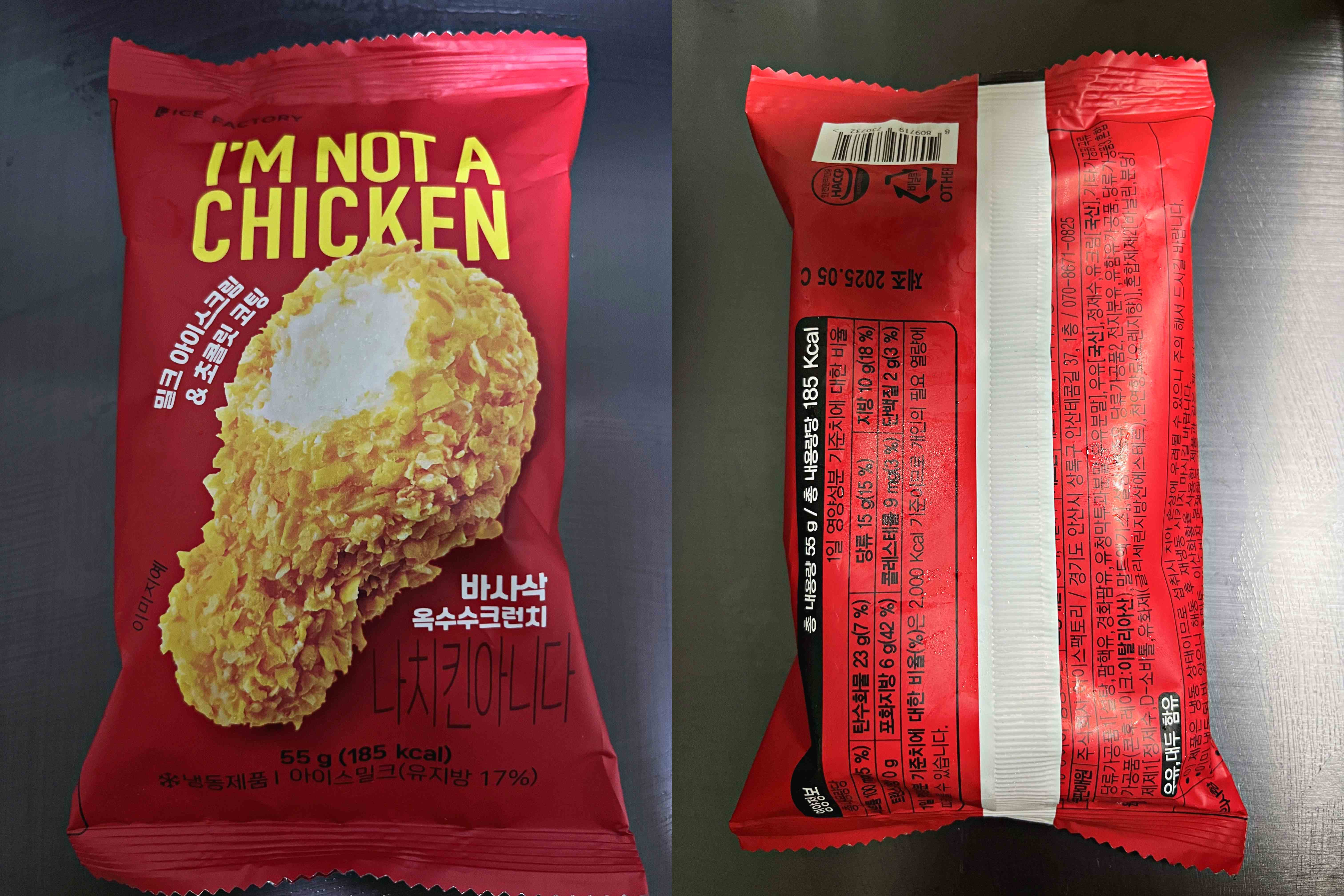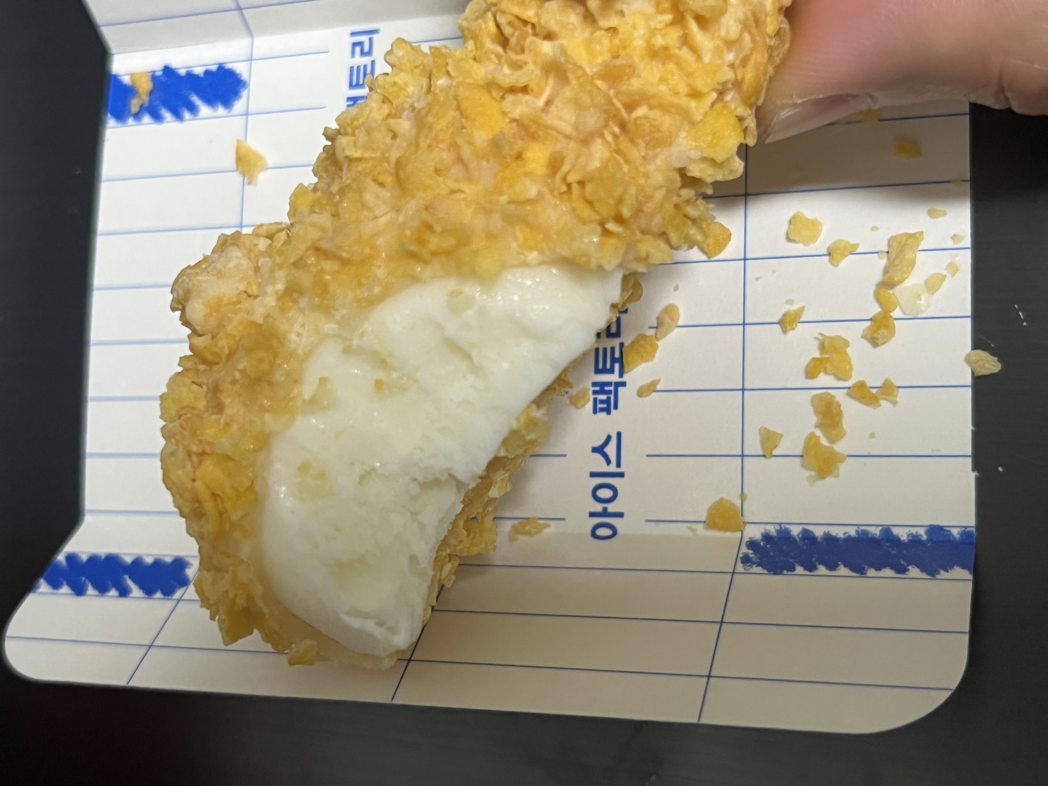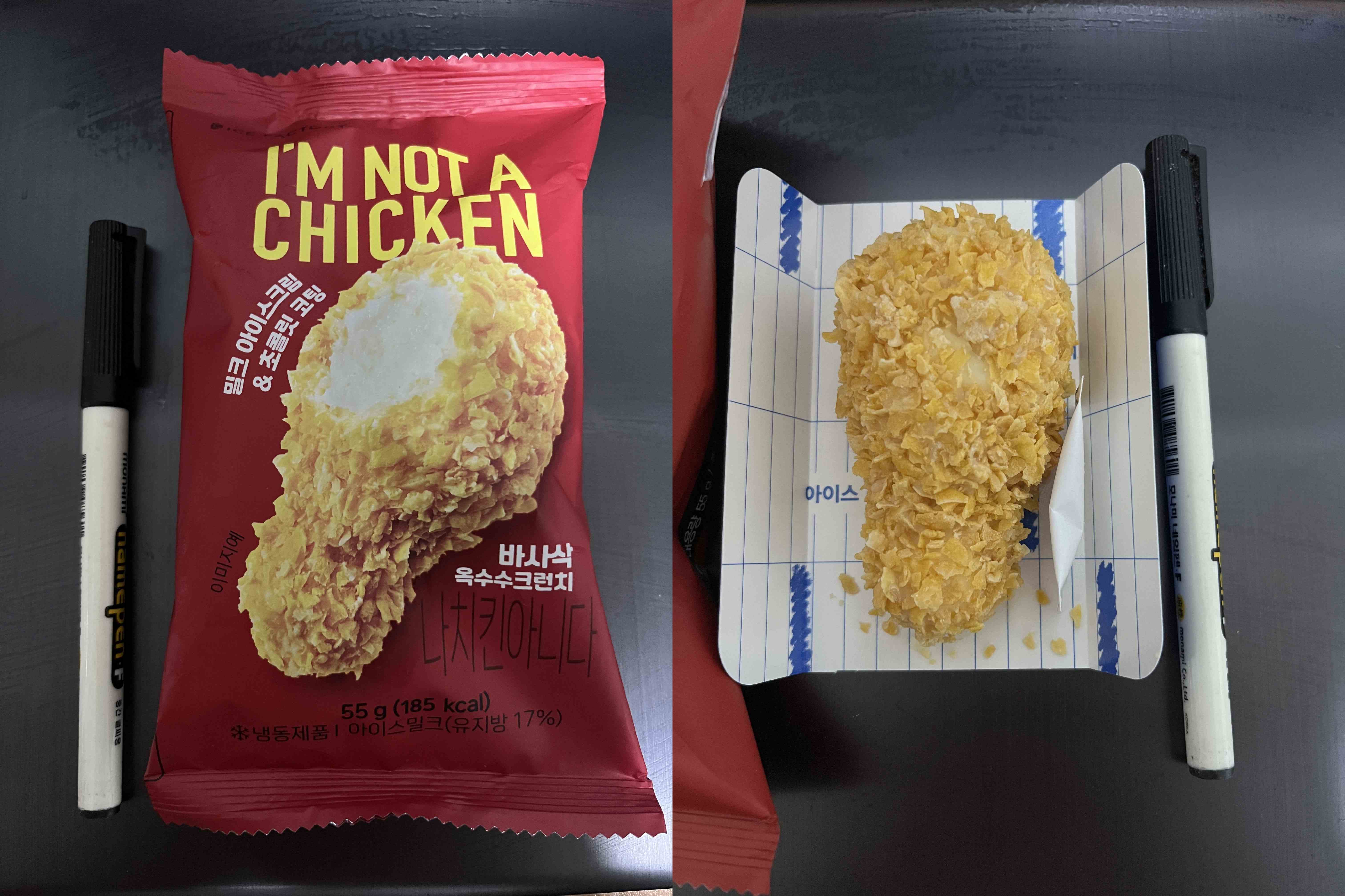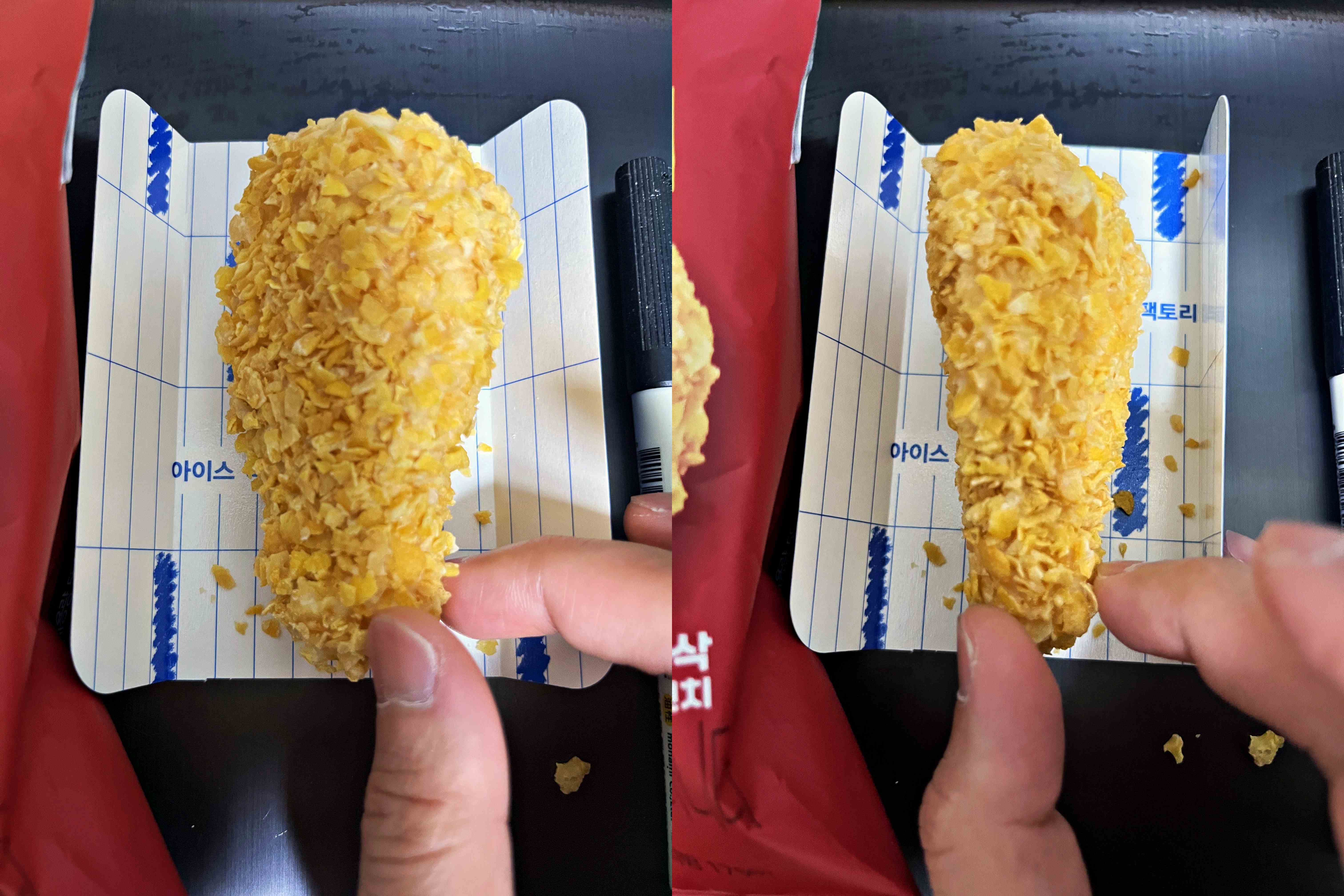 포장지도 재치도 있고 그럴싸하다. 겉에 튀김은 옥수수크런치, 안에는 화이트초콜릿이 코팅됐고 밀크 아이스크림이 들어있다.