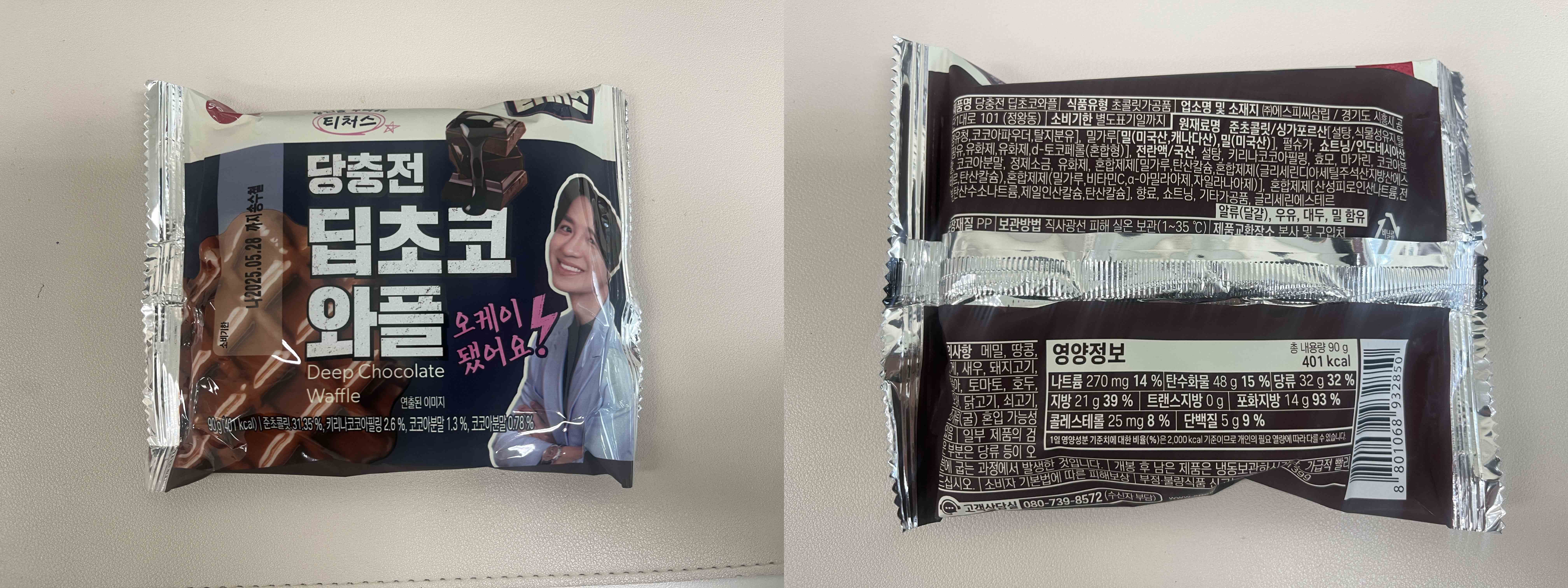 ✅티처스 당충전딥초코와플🏷️2,200원 *영양정보: 90g, 401칼로리(1일 영양성분 기준 나트륨 14%, 탄수화물 15%, 당류 32%, 지방 39%, 포화지방 93%, 콜레스테롤 8%, 단백질 9%)