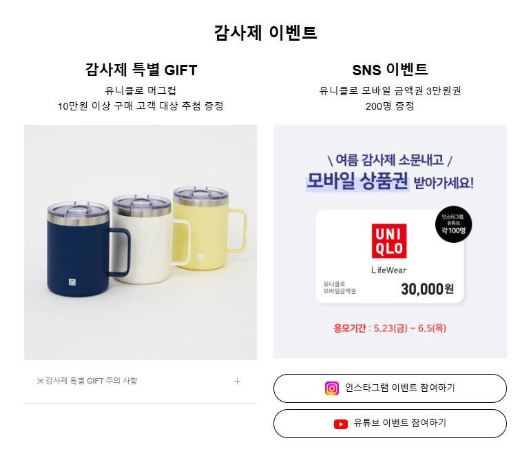 상단에 라인업은 일부 라인업이고 전체 라인업은 감사제 당일에 공개가 될 예정이다. 또한, 항상 감사제와 같이 진행하는 이벤트는 이번엔 10만 원 이상 구매 고객 시 유니클로 머그컵을 증정할 예정이다.
