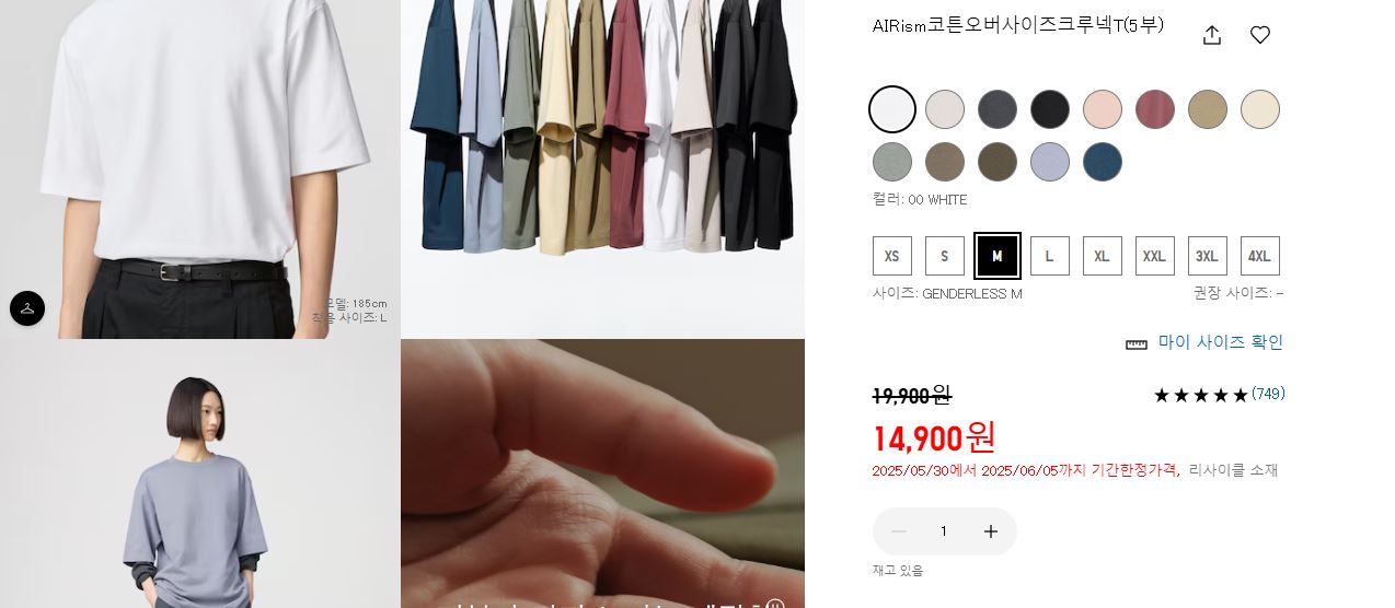 ✅유니클로 에어리즘 코튼오버사이즈크루넥T(5부) 19,900 > 14,900