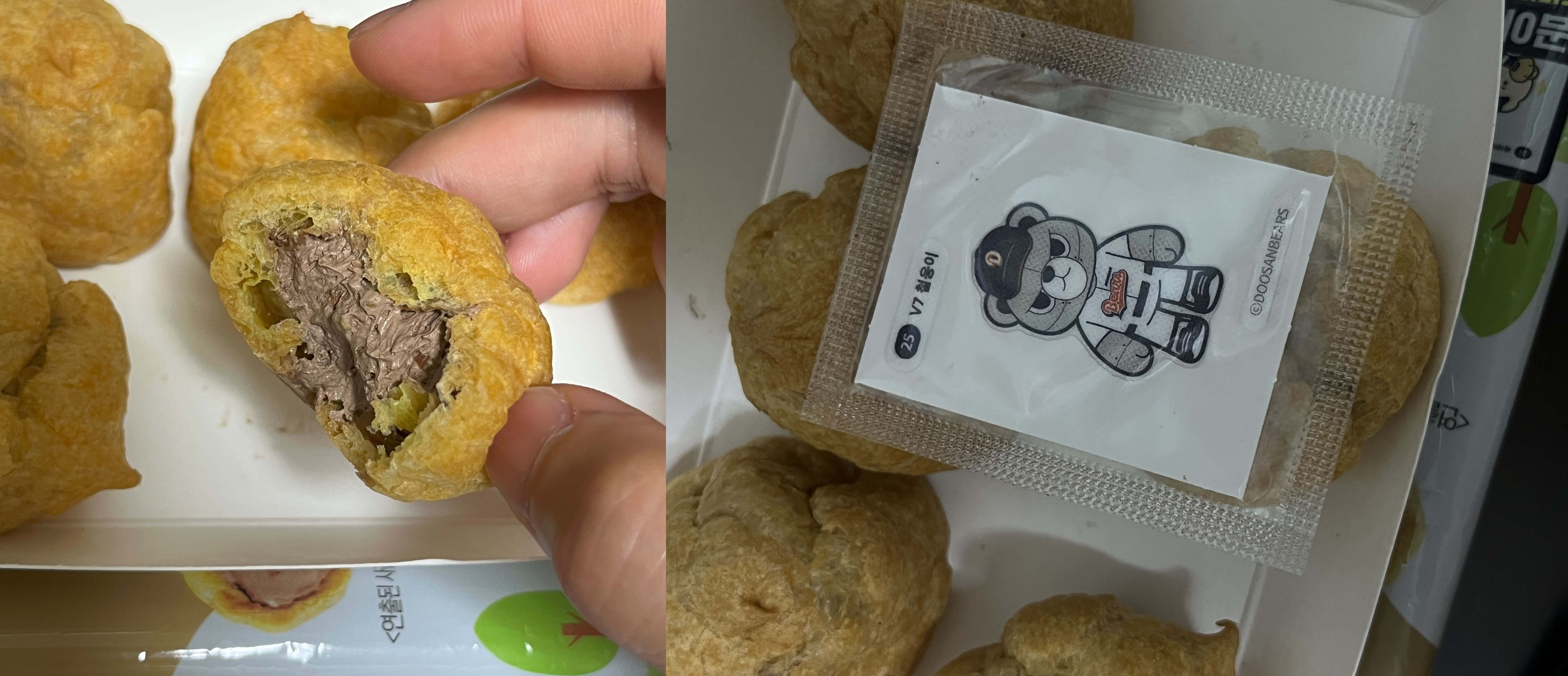 KBO 시즌에 맞춰 두산과 협업을 하고 있는 망그러진곰이 CU까지 합쳐 3자 협업으로 디저트를 내고 있다. 연세우유 허슬두 생크림빵만 있는 줄 알았는데 미니슈도 있어서 사 먹어봤다. 나는 볼초코 미니슈로 샀는데 초코맛 말고 오리지날 슈도 있다.