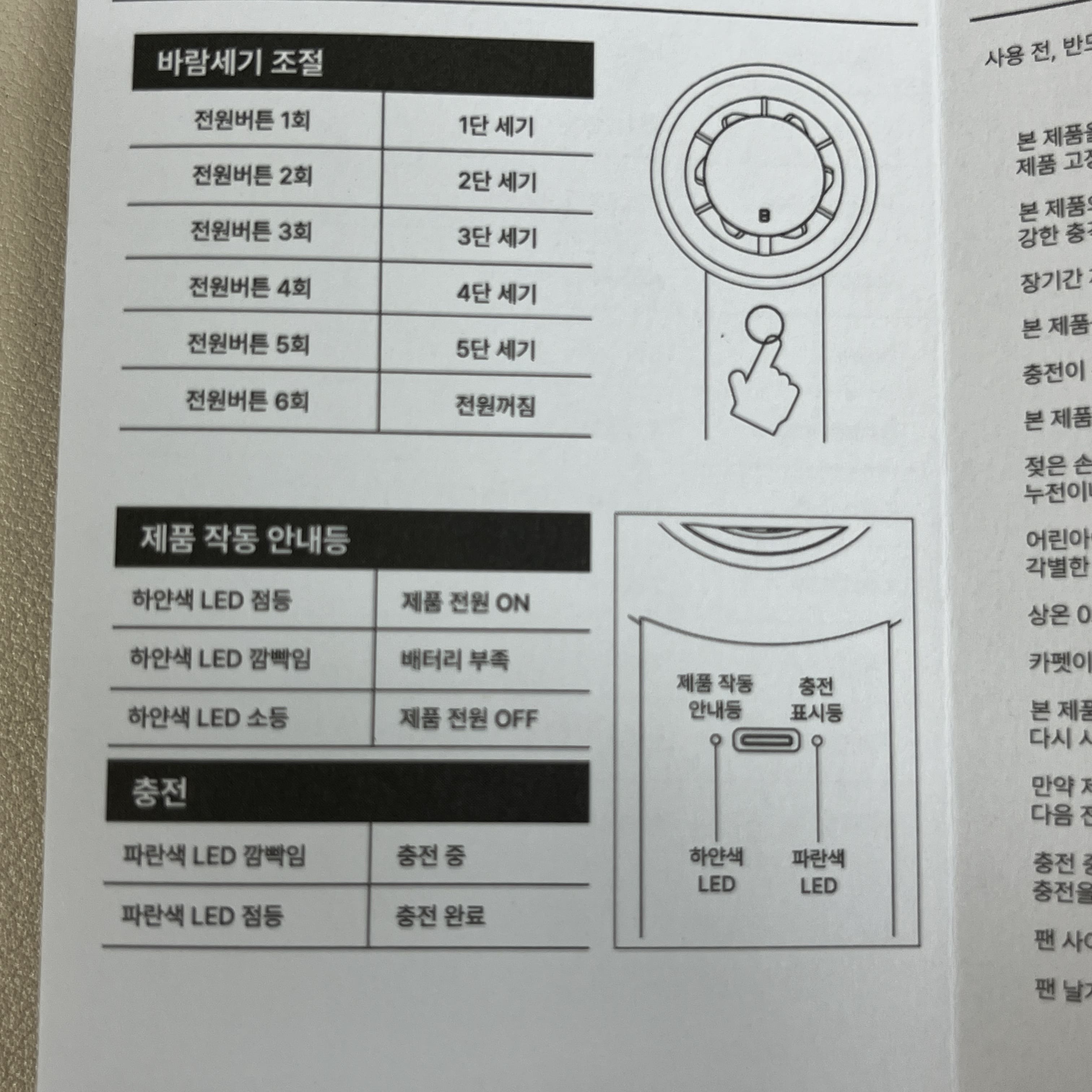 바람세기는 총 5단까지 가능한데 1단과 2단은 좀 소음도 거의 없고 약한 바람이다. 3단부터는 바람이 좀 부는 느낌이 확 난다. 3단부터 소음이 좀 나고 4단 5단은 바람이 세다. 단, 4단과 5단은 소음이 약간 미니 드라이기 같은 수준이다. 바람은 넓게 퍼지는 게 아니라 서큘레이터처럼 일자로 나가는 바람이다. 대중교통을 탔다면 4단 5단은 소음 때문에 하기가 쉽지 않을 듯