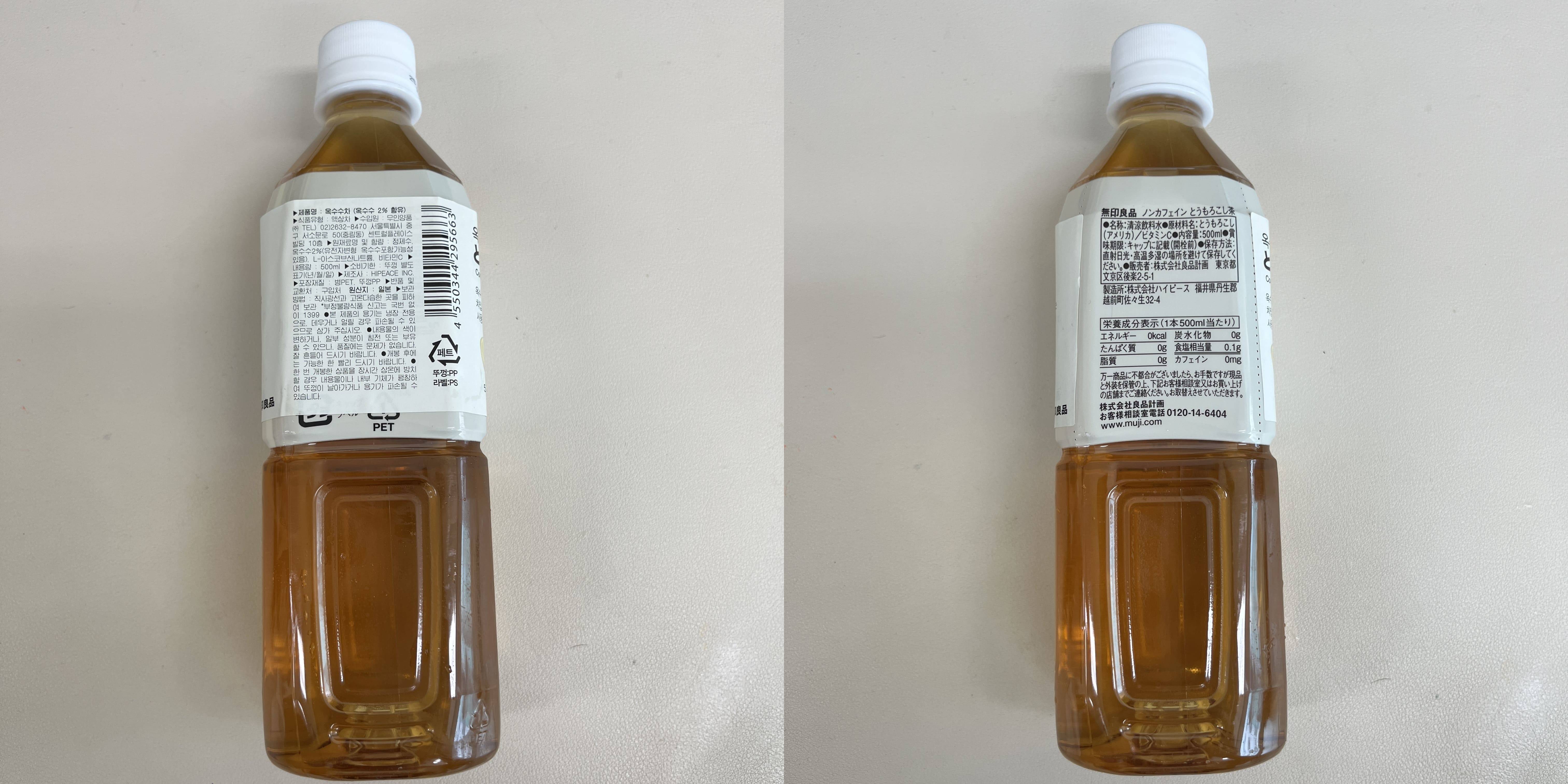 특별할거는 따로 없는 평범한 옥수수차다. 가격이 2,500원이고 원산지가 일본일 뿐. 직사광선과 고온다습한 곳만 피해서 보관하라고 한다. 500ml 페트에 들어있어서 내용은 넉넉한 편. 옥수수는 GMO 옥수수도 들어갈 수 있다고 한다.