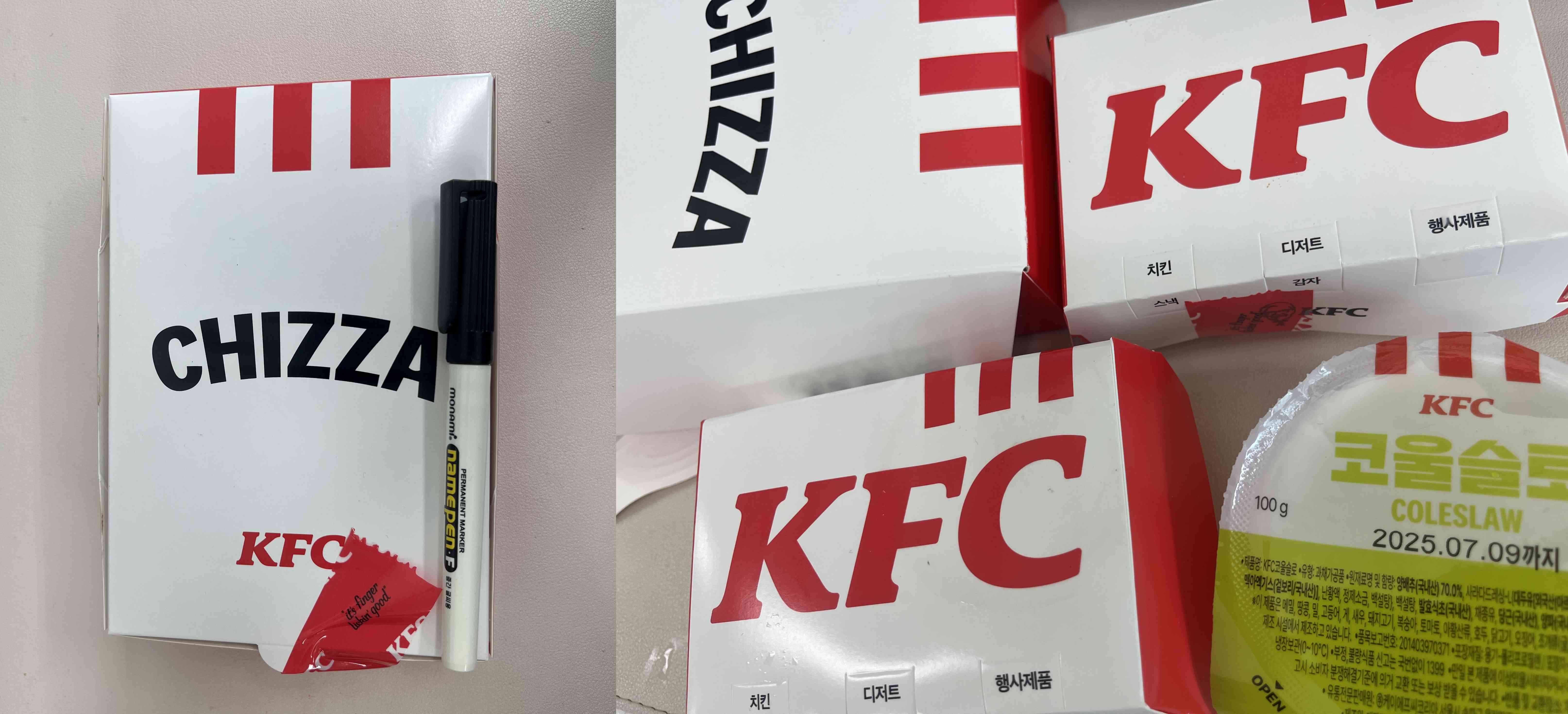 나는 켄치짜 슈퍼박스로 먹었다. 켄치짜는 크기가 거의 네임펜 길이만 했음. 그리고 음료와 통다리랑 코울슬로에 후식으로 먹을 에그타르트까지 구성이 좋다.