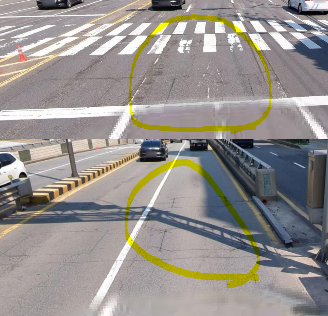 카메라 전방 50~60m 바닥에 감지선이 매립돼 있다. 바닥을 보면 하단과 같이 사각형 모양이 감지선이 매립된 곳이다. 카메라에서 대략 60m 떨어진 곳에 첫 감지선이 있고 20~30m 가면 두 번째 감지선이 나온다.
