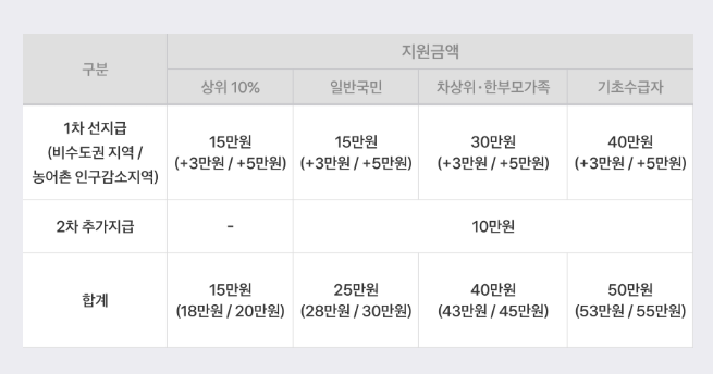 - 1차 지급 비용: 전 국민 1인당 15만 원, 차상위계층 30만 원, 기초생활수급자 40만 원, (추가 혜택: 비수도권 지역 1인당 3만 원 추가, 농어촌 인구감소지역(84개 시·군) 1인당 5만 원 추가)