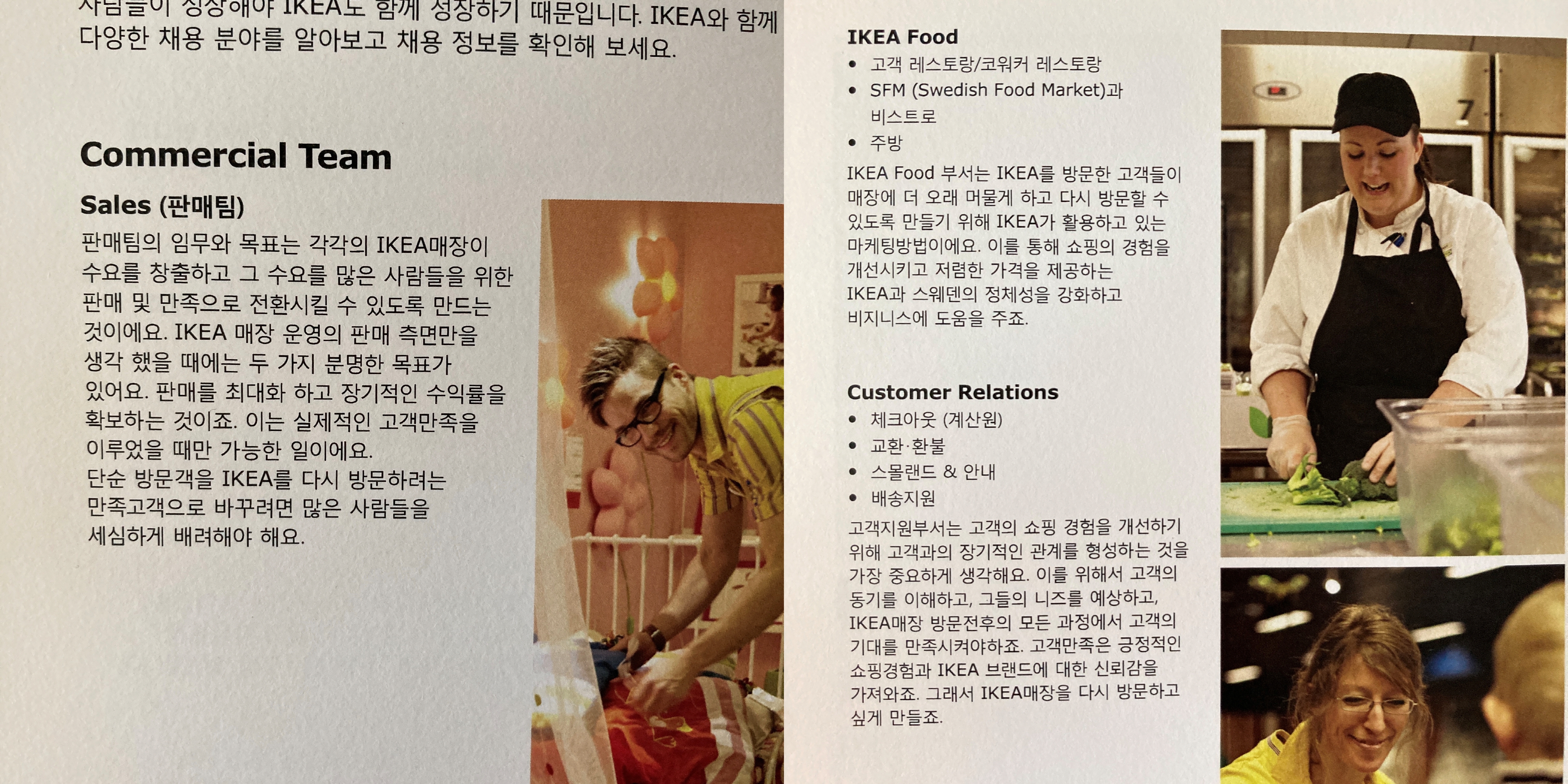 흔히 말하는 코워커들은 세일즈, 푸드, 고객지원팀으로 주로 간다. 세일즈는 이케아 매장 안에서 진열하고 손님들 도와드리고 이런 역할이라고 보면 되겠다.