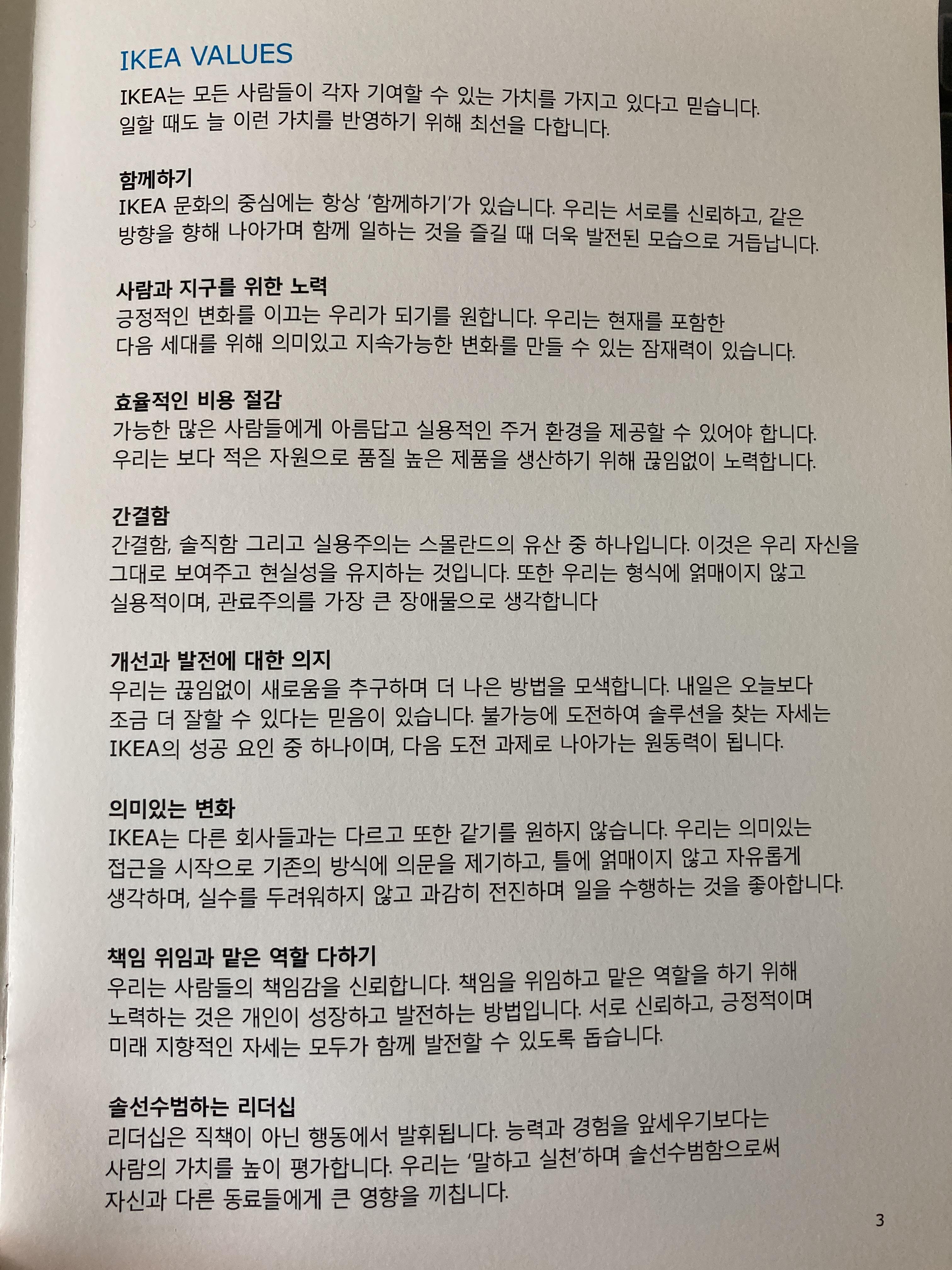 인테리어, 비주얼 디자인과 오퍼레이션은 뽑는 인원 자체도 소수이며, 영어로 의사소통이 원활하게 가능해야 한다. 자세히 살펴보기 전에 그때 받았던 책자에 있던 이케아의 가치(Value)와 각 직무의 소개는 다음과 같다.