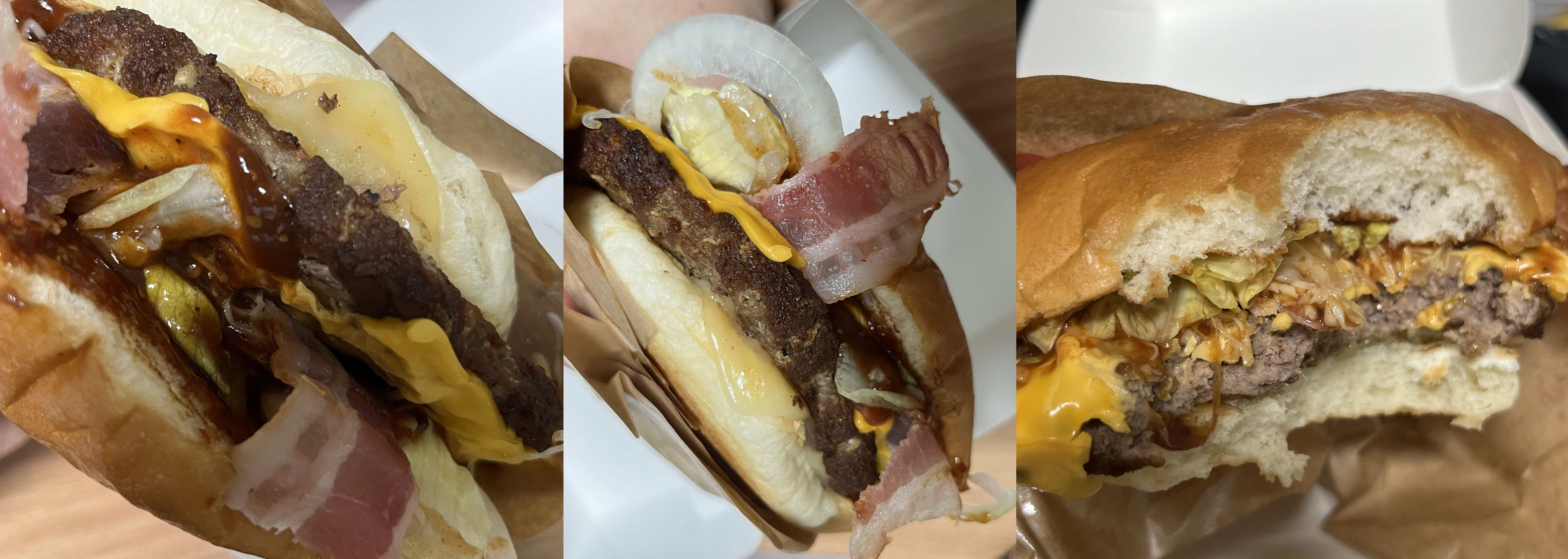 스테이크 패티 위로는 치즈, 양파, 양상추와 베이컨, 뉴욕 스테이크 소스가 있다. 패티 아래에는 몬테레이잭 치즈가 있는데 패티의 열기에 잘 녹아서 붙어있다. 크리미하고 강하지 않은 치즈향에 좀 부드러운 느낌을 주었다. 먹어봤을 때 신경을 쓴 느낌이 난다. 포장해서 좀 열기가 식은 다음에 먹었는데 식기 전에 먹었으면 훨씬 맛있었을 것 같다.