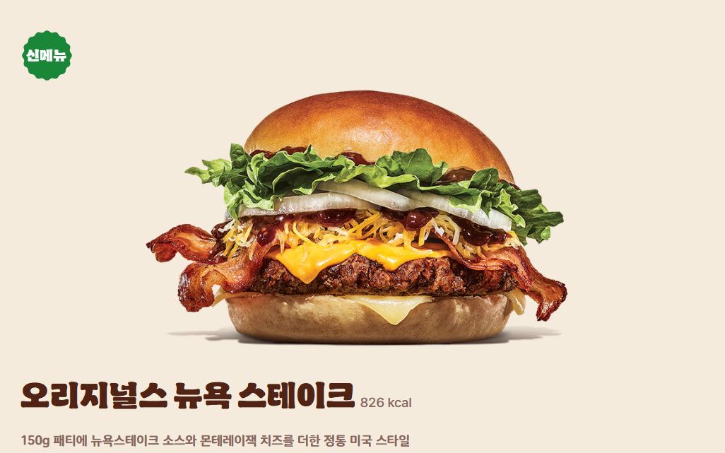 *150g 패티의 뉴욕스테이크 소스와 몬테레이잭 치즈를 더한 미국 스타일 버거