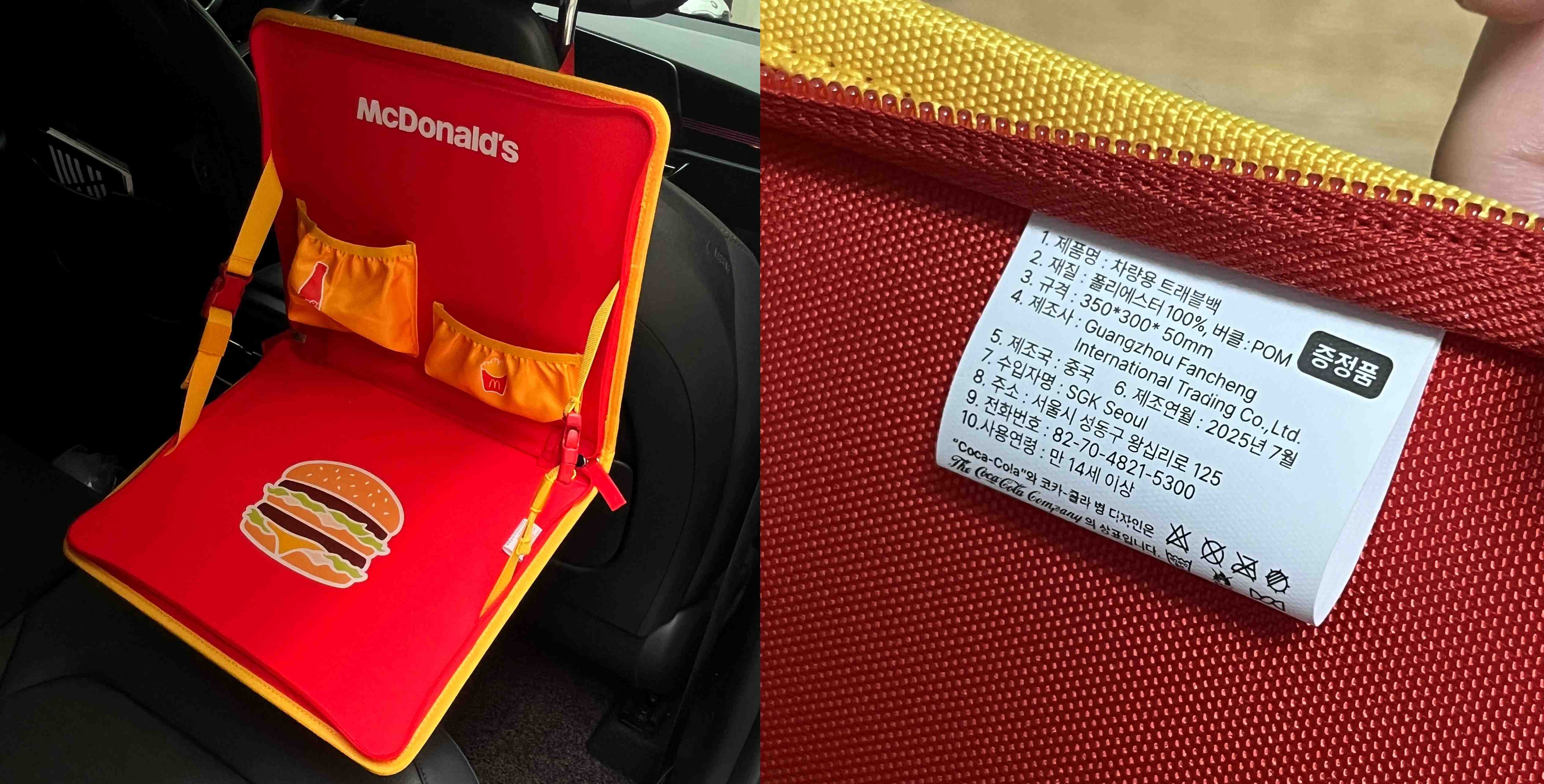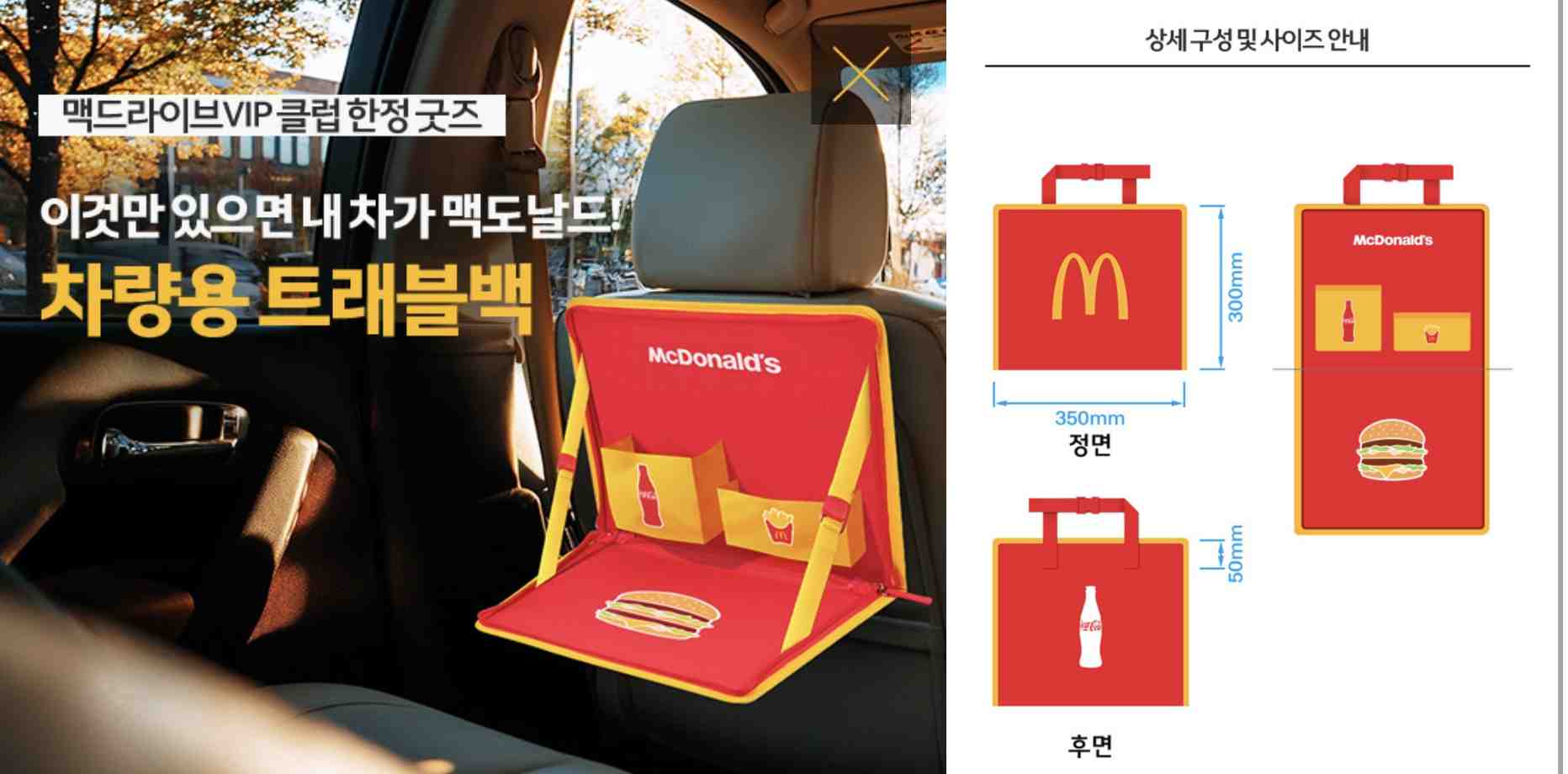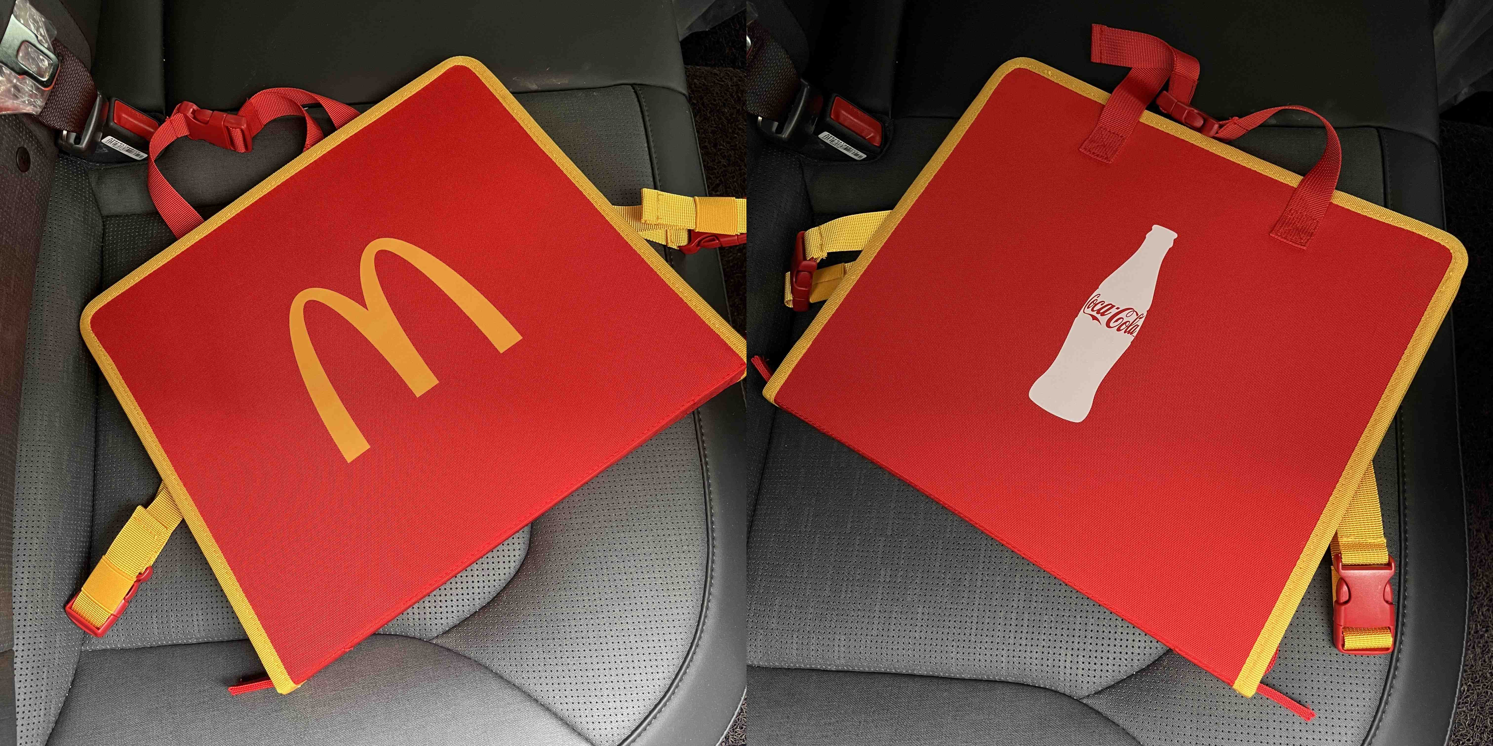 크기는 가로 35cm, 세로 30cm 정도가 된다. 정면엔 맥도날드 마크, 후면엔 코카콜라 마크가 쓰여있고 내부엔 감자튀김이랑 콜라 사이즈에 맞춘 주머니가 있다. 의자에 걸어서 탁상으로 쓸 수 있는 것 같았다.