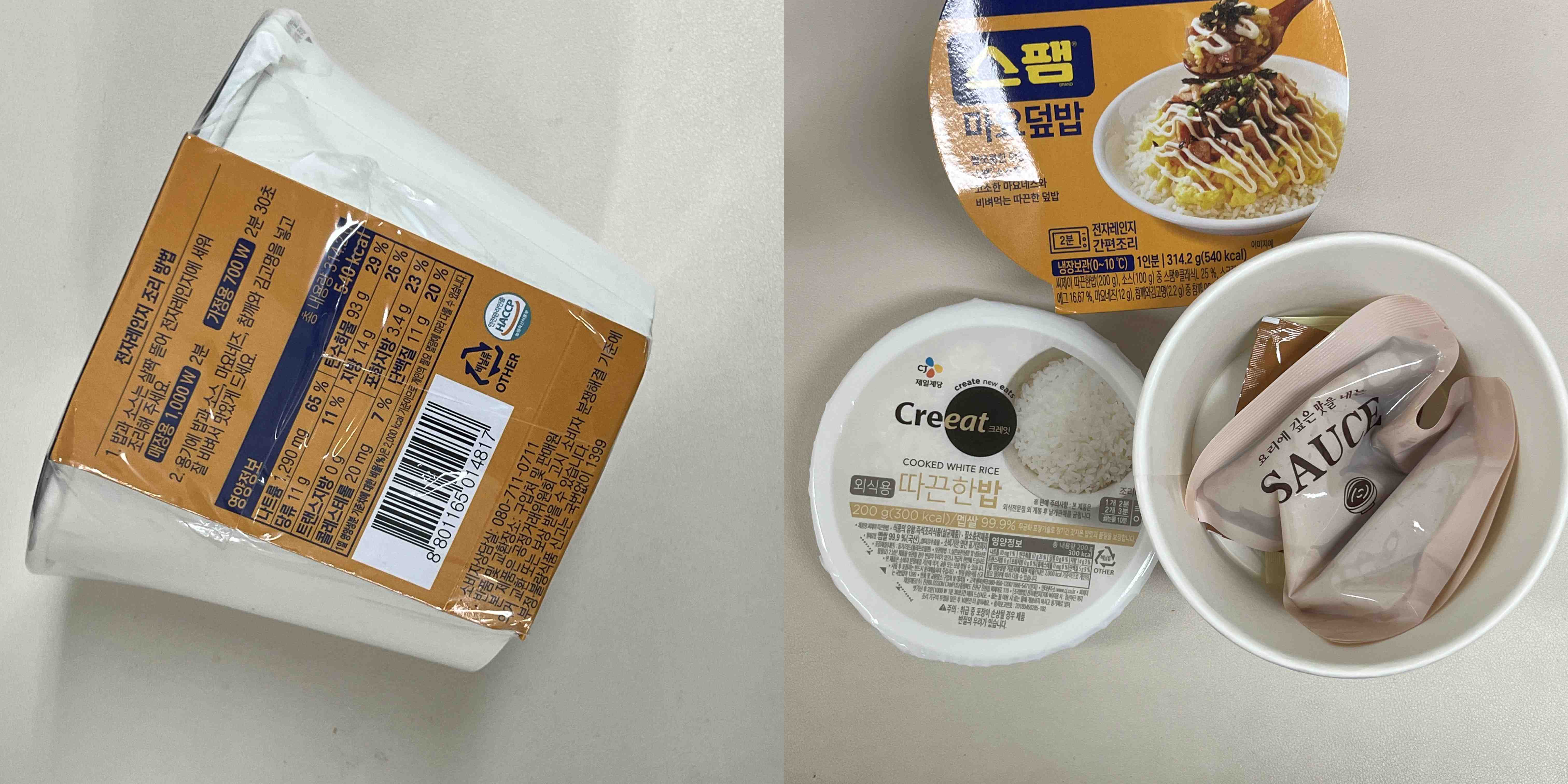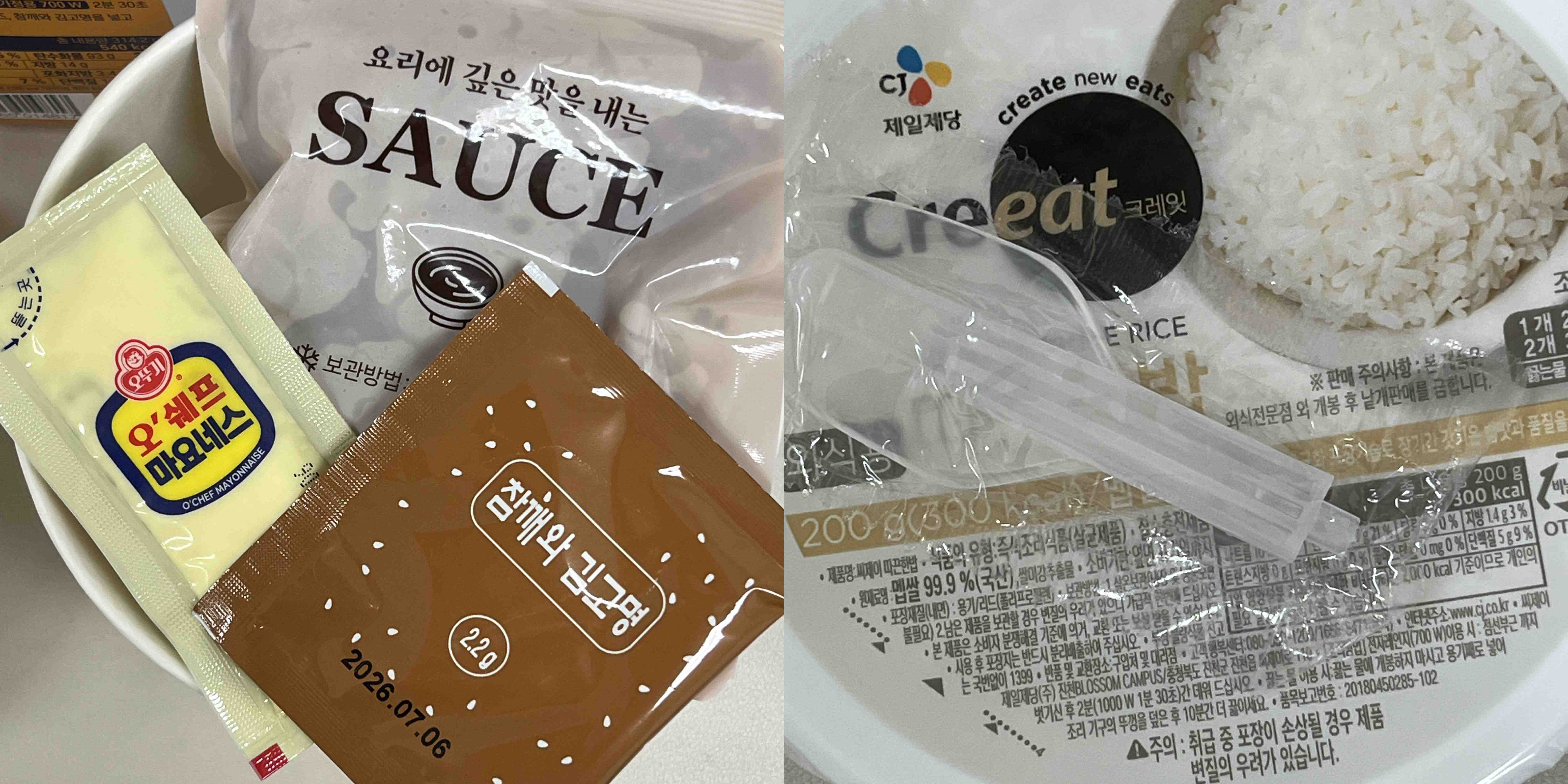 오뚜기 컵밥이나 덮밥처럼 즉석 쌀밥 큰 공기 하나와 김자반, 마요네즈, 그리고 덮밥 소스가 들어가 있다. 일회용 숟가락도 있는데 이거 크기도 너무 작고 안쪽으로 접히는 방식이라 밥 섞어줄 때 숟가락이 혼자 접힐 때도 있어서 좀 불편하다.