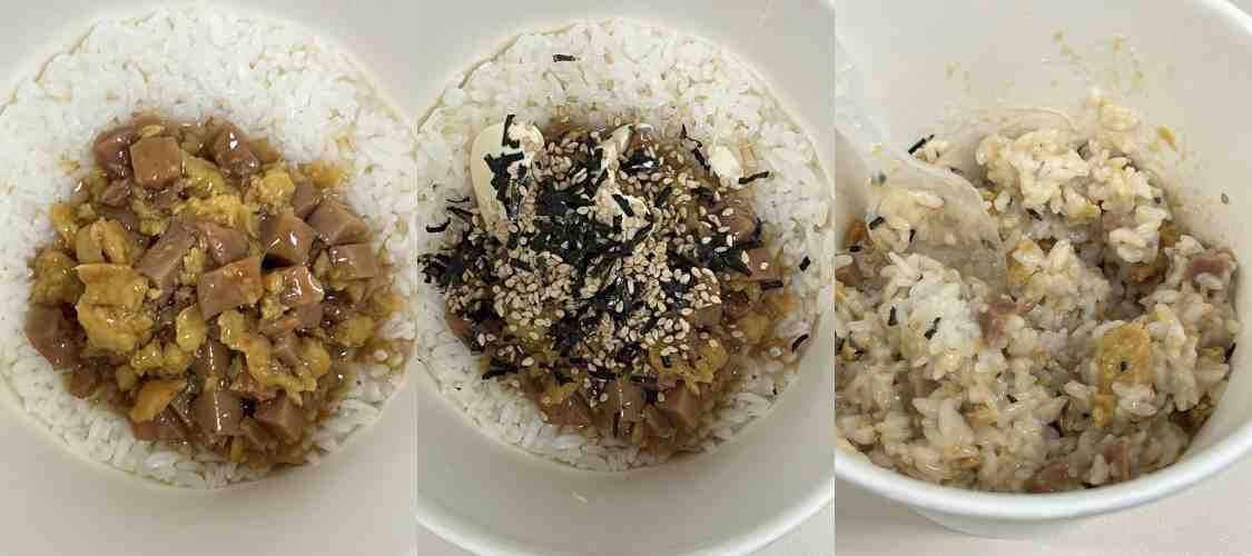 즉석밥이랑 소스만 전자레인지에 2분 정도 데운 후에 마요네즈랑 김자반 뿌려서 섞어주면 끝. 간단한 조리법이다. 스팸이 막 많이 들어가 있진 않다. 소스는 약간 하이라이스 냄새도 나서 이 부분은 개인적으로 살짝 불호였다. 맛은 무난한데 치킨 마요가 더 맛있다.