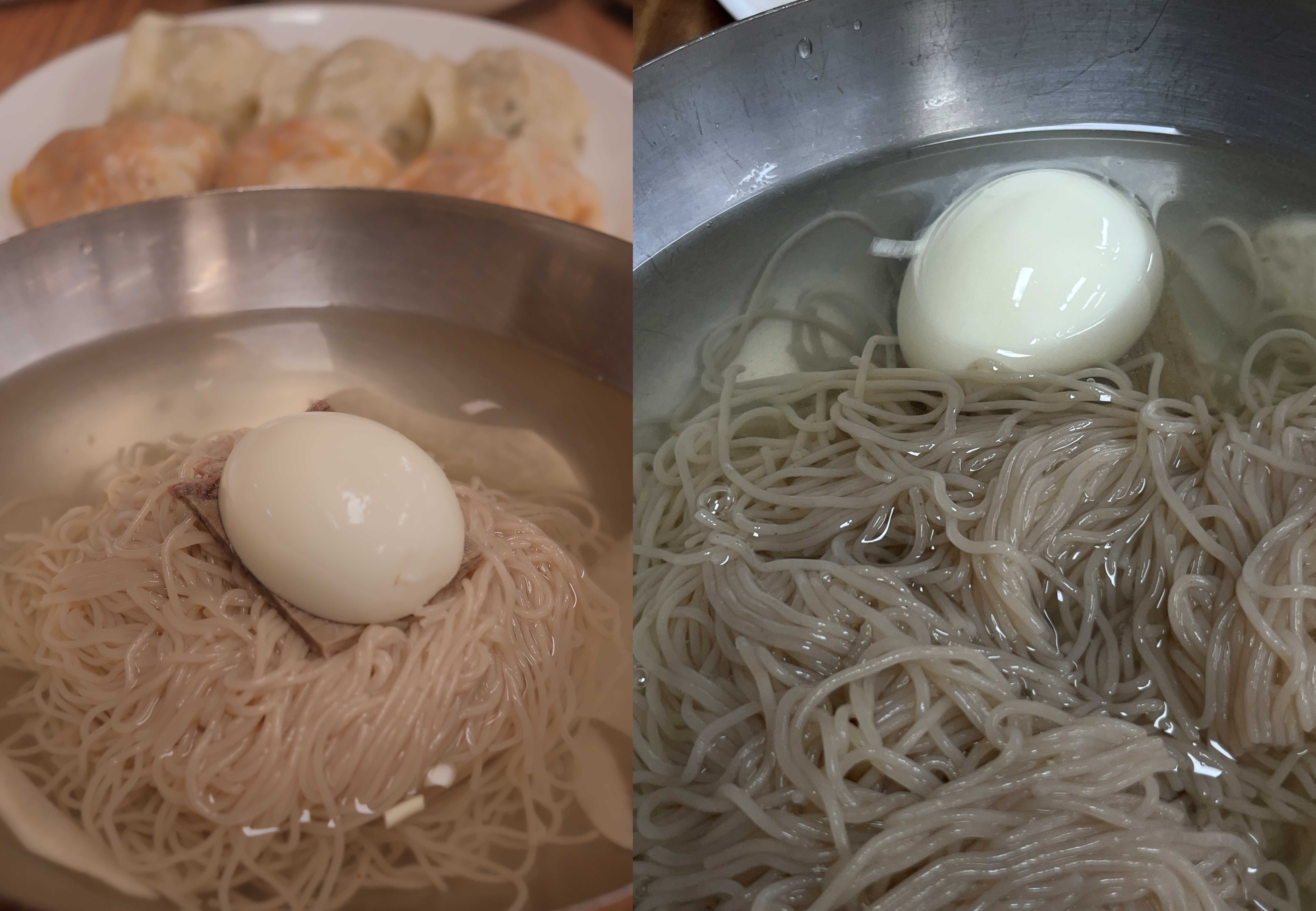 그리고 금방 나온 평양냉면. 계란과 편육이 올라가 있다. 편육이 좀 더 있었으면 좋겠다 싶었다. *냉면에 계란이 있는 이유는 메밀 면이 거칠고 차기 때문에 계란 노른자가 위벽을 보호해 줘서 소화에 도움을 주는 역할이라고 한다.