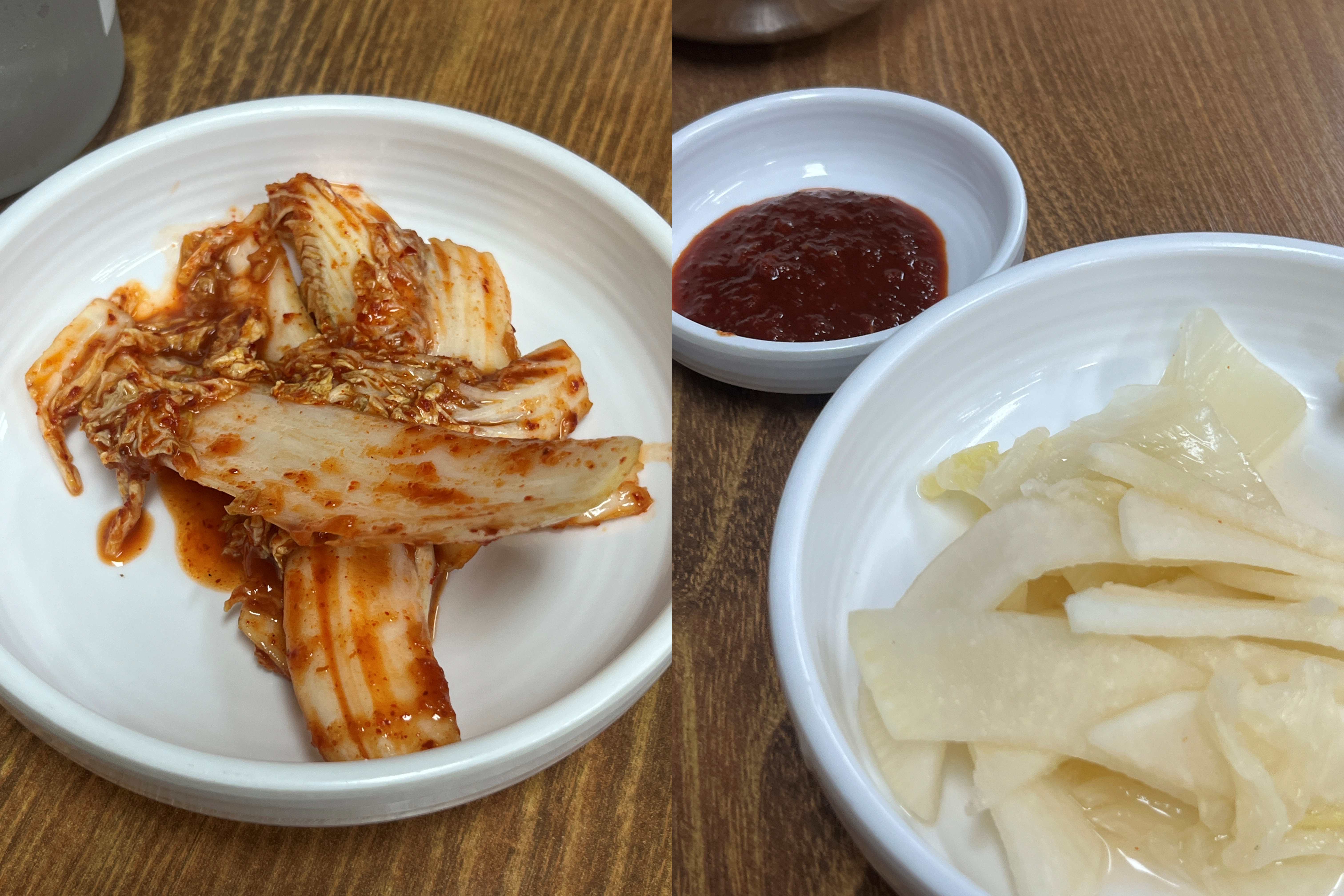 밑반찬으로 겉절이와 쌈무 같은 게 나온다. 슴슴보단 조금 자극적인 겉절이다. 근데 맛있다.