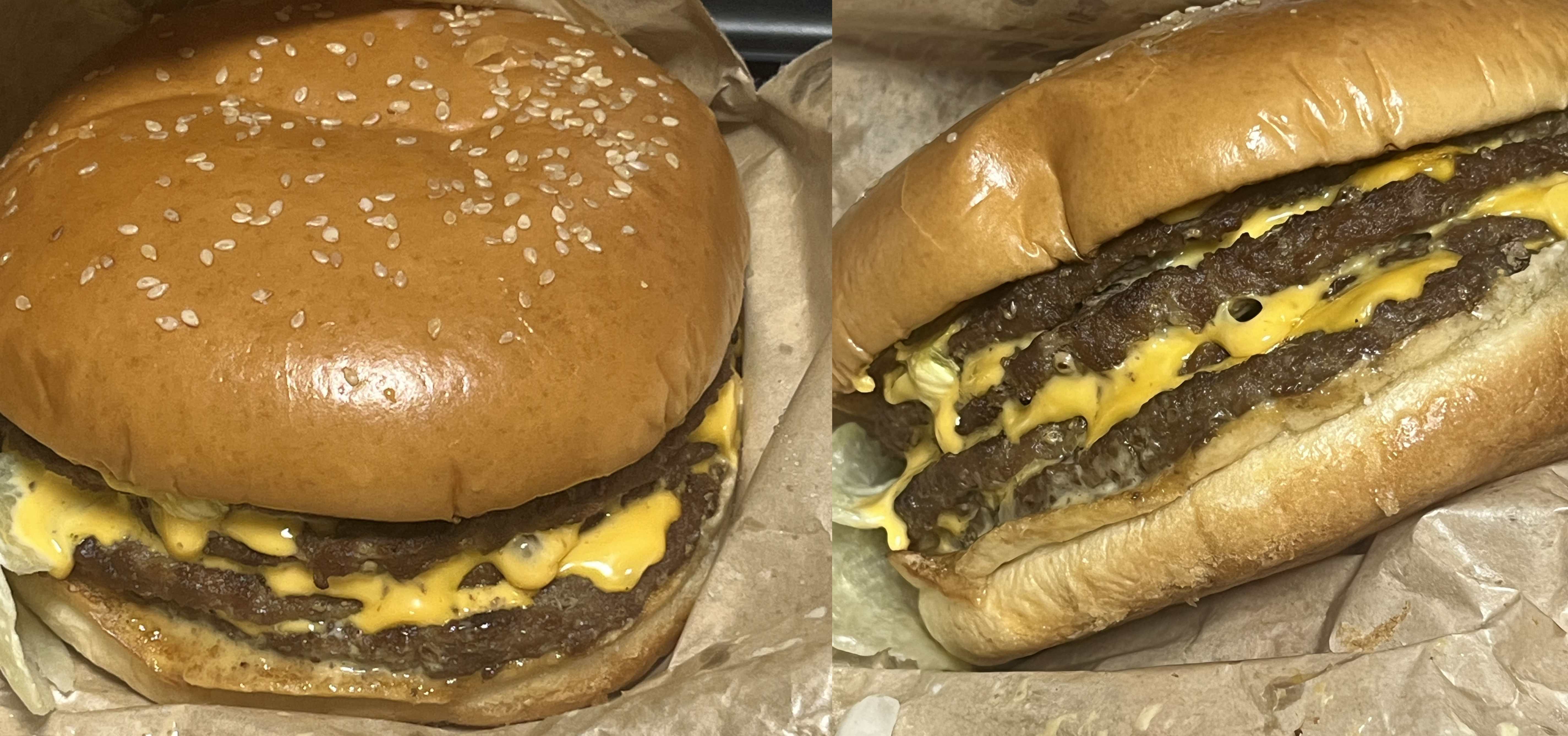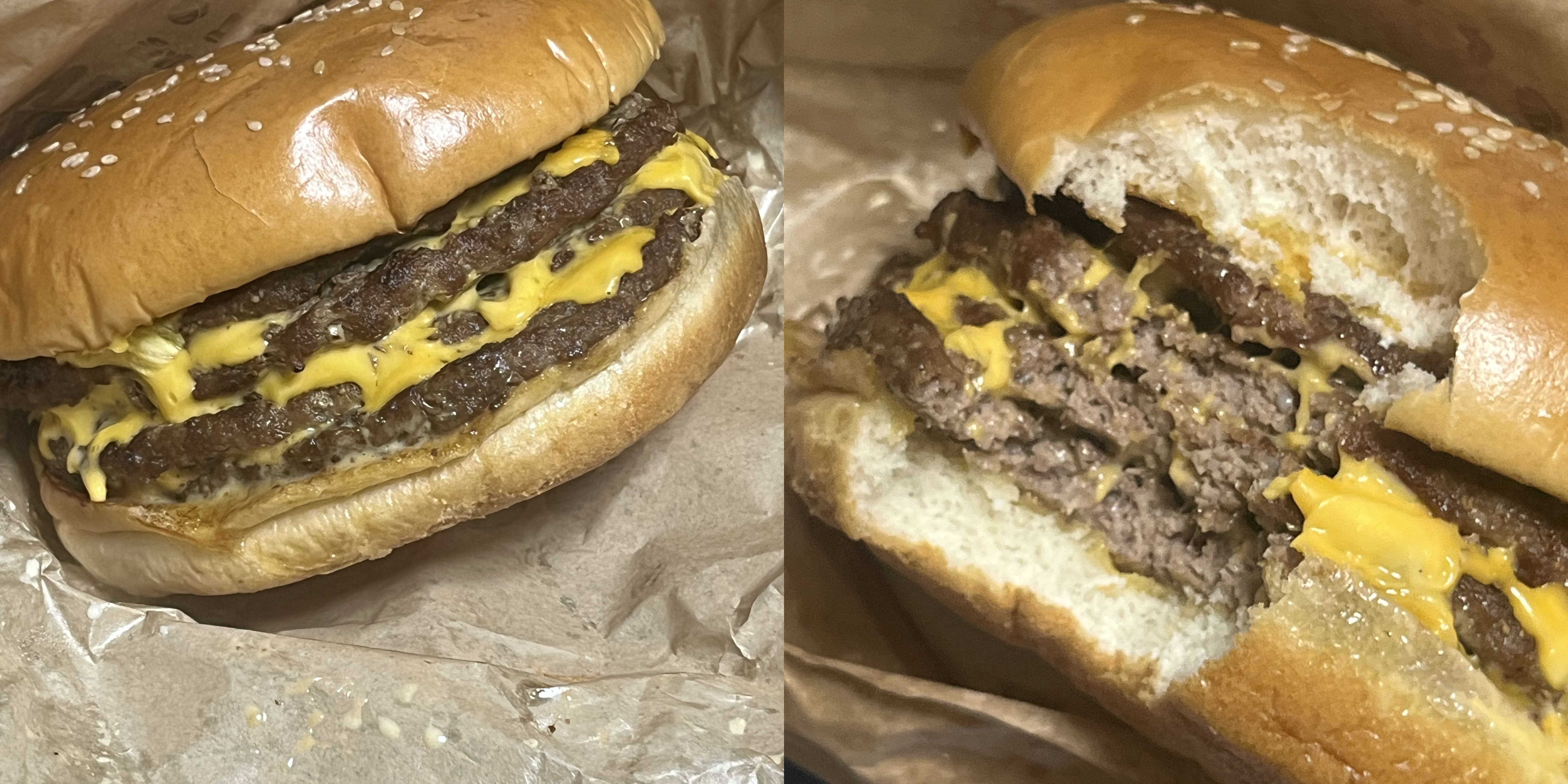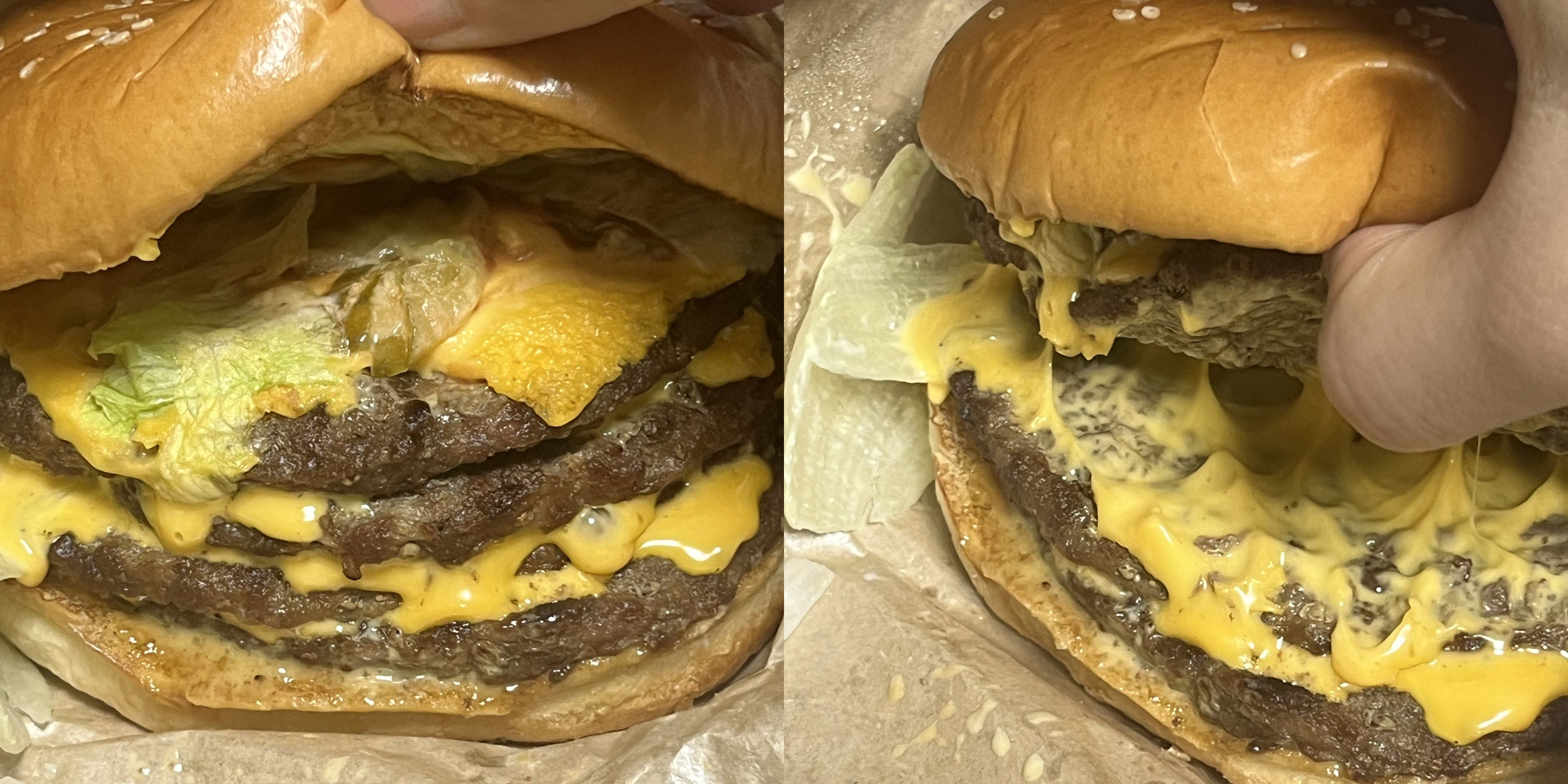 포장을 열면 기름진 냄새가 확 난다. 치즈와 직화 비프 패티의 향이 나고 반들반들하다. 막상 열어보니 압도적인 느낌은 좀 들하다. 그러나 확실히 패티 4장과 그 사이사이 치즈 8장이 들어간걸 보니 많기는 진짜 많다.