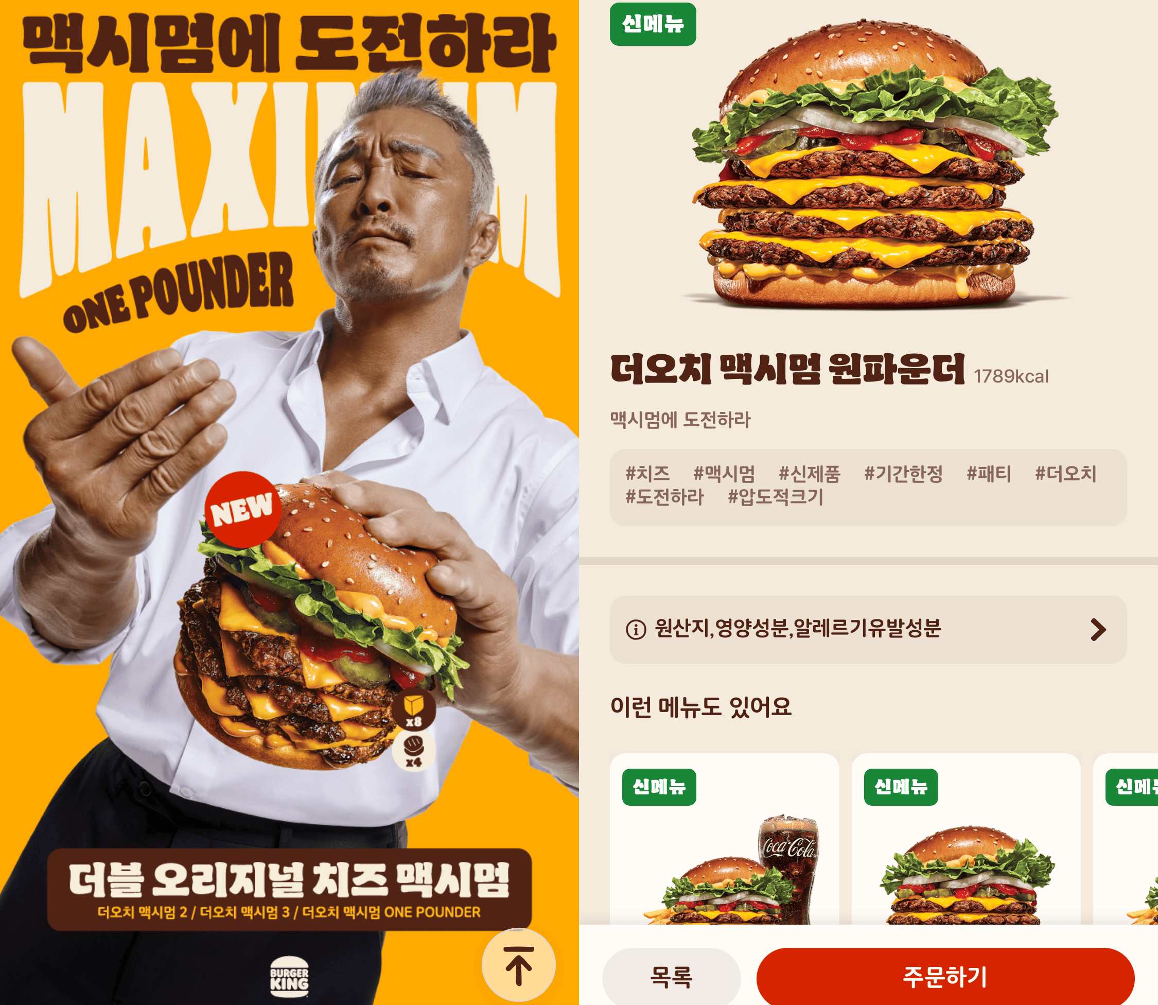 버거킹에서 미쳐버린 신메뉴가 나왔다. 바로 더오치 맥시멈. 패티와 치즈를 더더 넣은 건데 그중 가장 끝판왕으로 낸 것이 더오치 맥시멈 원파운더다. 추성훈 씨가 광고 모델로 있고 들고 있는 것부터 심상치가 않다.