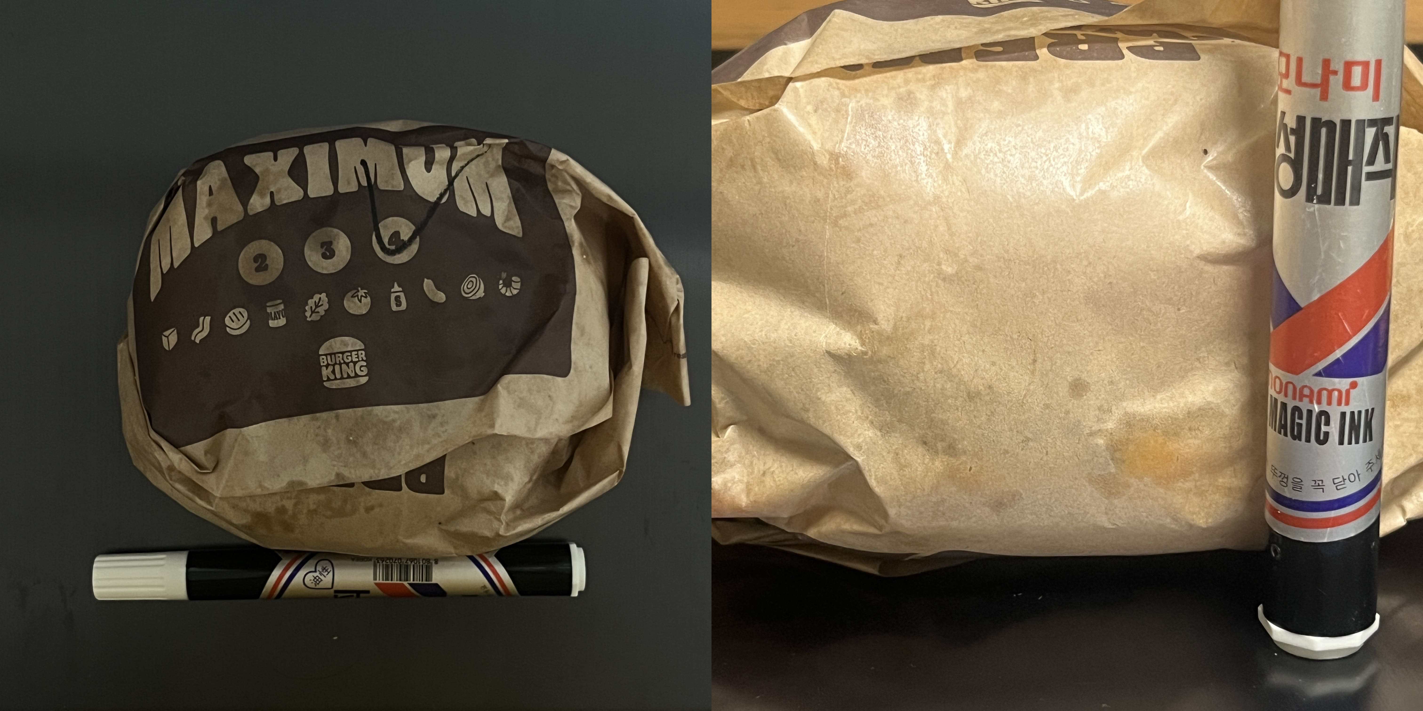 치즈 8장과 패티 4장이 들어갔기 때문에 칼로리가 미쳤다. 가격도 미쳤다. 그래도 호기심을 참지 못하고 한번 사서 먹어봤다. 일단 진짜 무겁다. 600g이라서 고기 한 근과 같은 무게기 때문에 봉투를 들었을 때 묵직하다. 길이는 와퍼랑 비슷한데 두께가 진짜 매직 3분의 2 정도 된다.