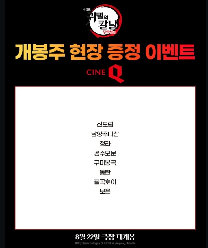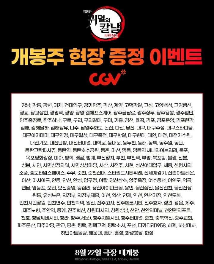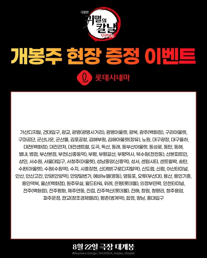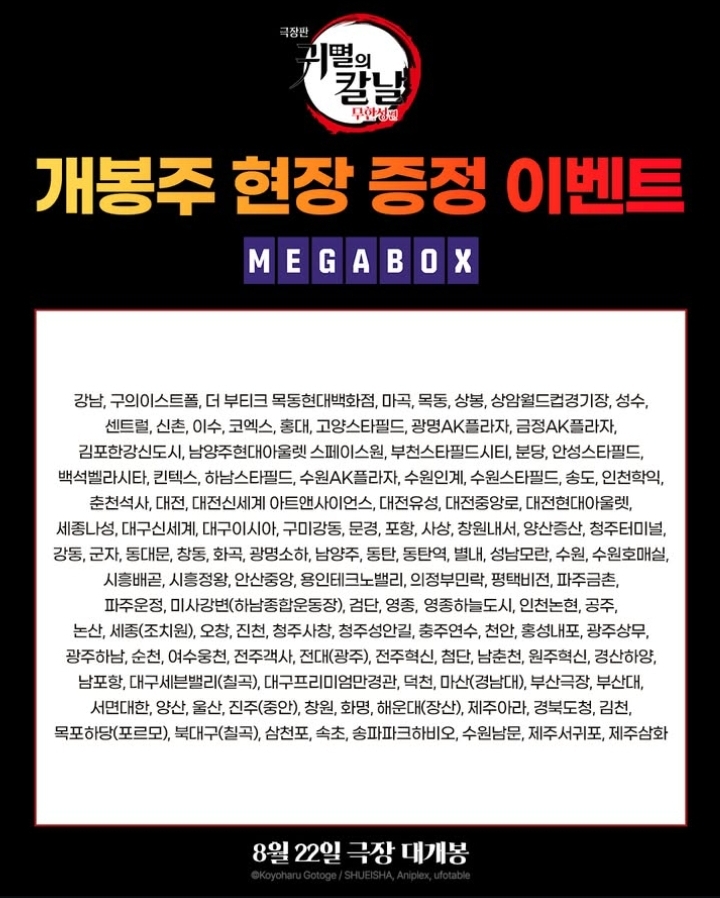 귀멸의 칼날 : 무한성편 개봉을 앞두고 국내 영화관 특전이 공개되고 있다. 귀멸의 칼날 무한성편은 25년 8월 22일이며 지난주에 이미 사전 상영회가 진행이 됐다. 가장 빠른 22일 0시에 특별 상영을 하는 곳은 서울 코엑스와 수원AK 메가박스다. 이미 귀멸의칼날 무한성편은 사전 예매가 50만 명 달성.
