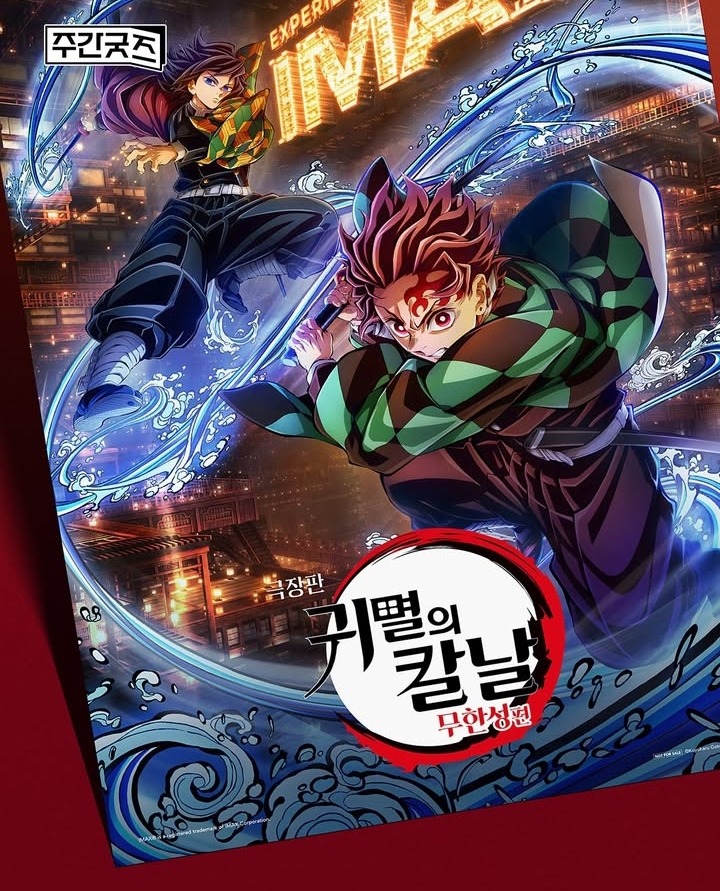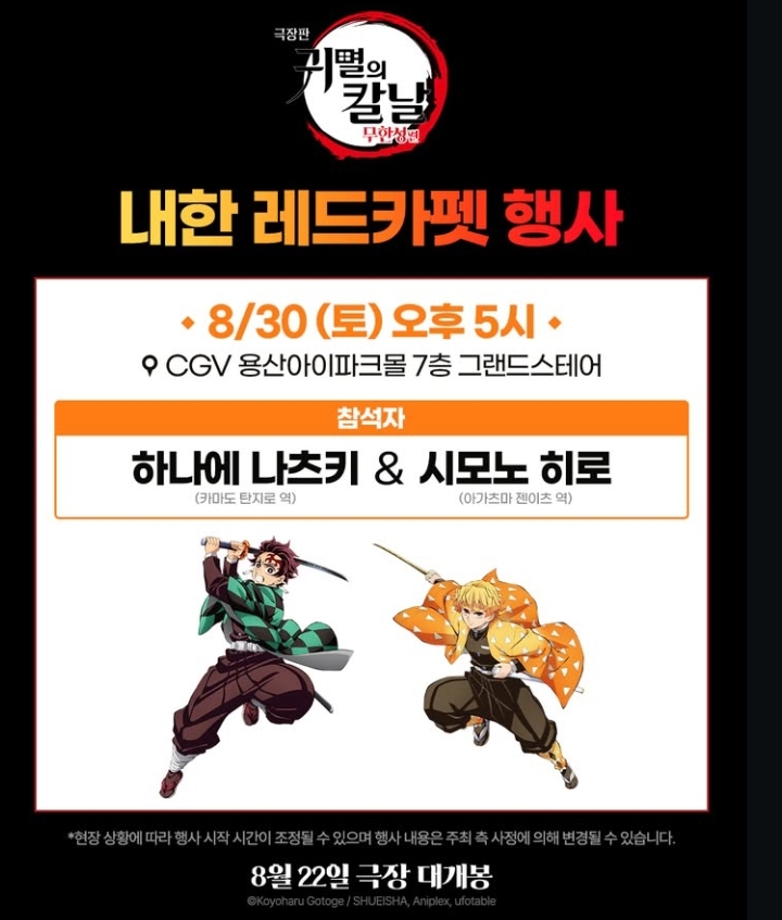 CGV 아이맥스 포스터는 25년 8월 22일(금)이 아닌 2주차 시작 8월 27일(수)부터 증정. 또한, 25년 8월 30일(토) 17시 CGV 용산아이파크몰 7층 그랜드수테어에서 카마도 탄지로를 맡은 하나에 나츠키, 젠이츠 역을 맡은 시모노 히로 성우가 내한 예정