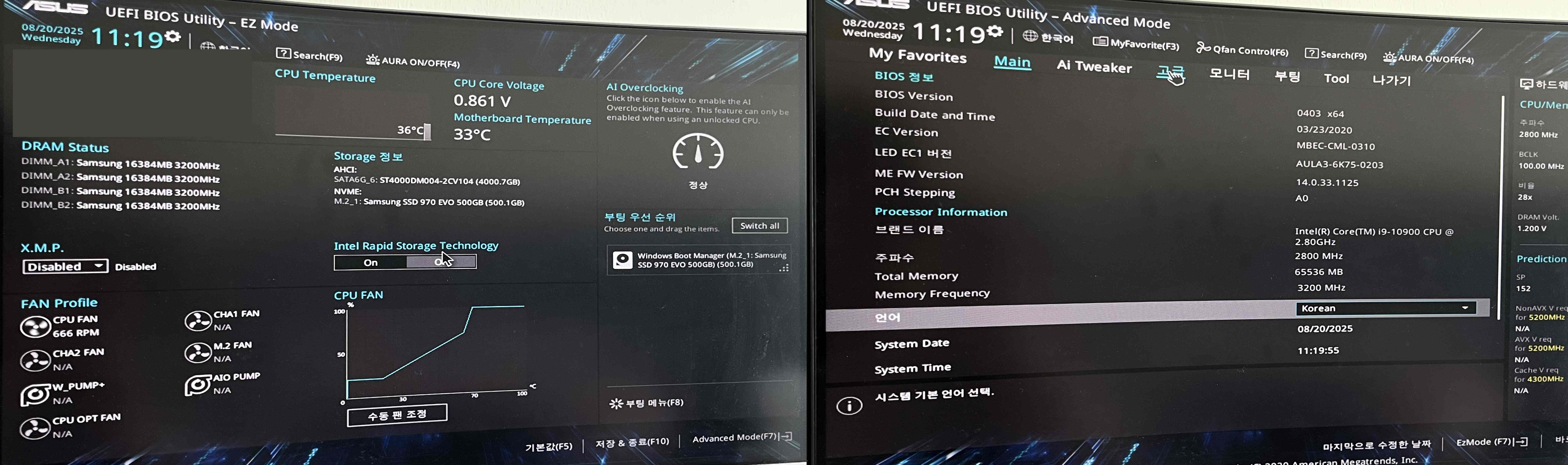 운영체제에 따라 바이오스 모드에 들어가는 버튼이 다르지만 보통은 F2 혹은 Del 버튼이다. 제조사마다 다르므로 이는 구글에 검색하면 금방 찾을 수 있다. 부팅이 시작되고 나서 바이오스 모드로 들어가는 버튼을 눌러준다. ASUS의 경우는 Del 버튼이다. 버튼을 누르면 아래와 같은 바이오스 모드가 뜬다.