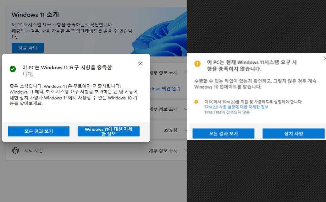 따라서 TPM 기능이 없는 컴퓨터는 거의 없는데 이 기능이 활성화가 되지 않았을 경우 하단 오른쪽과 같은 문구가 뜨게 된다.