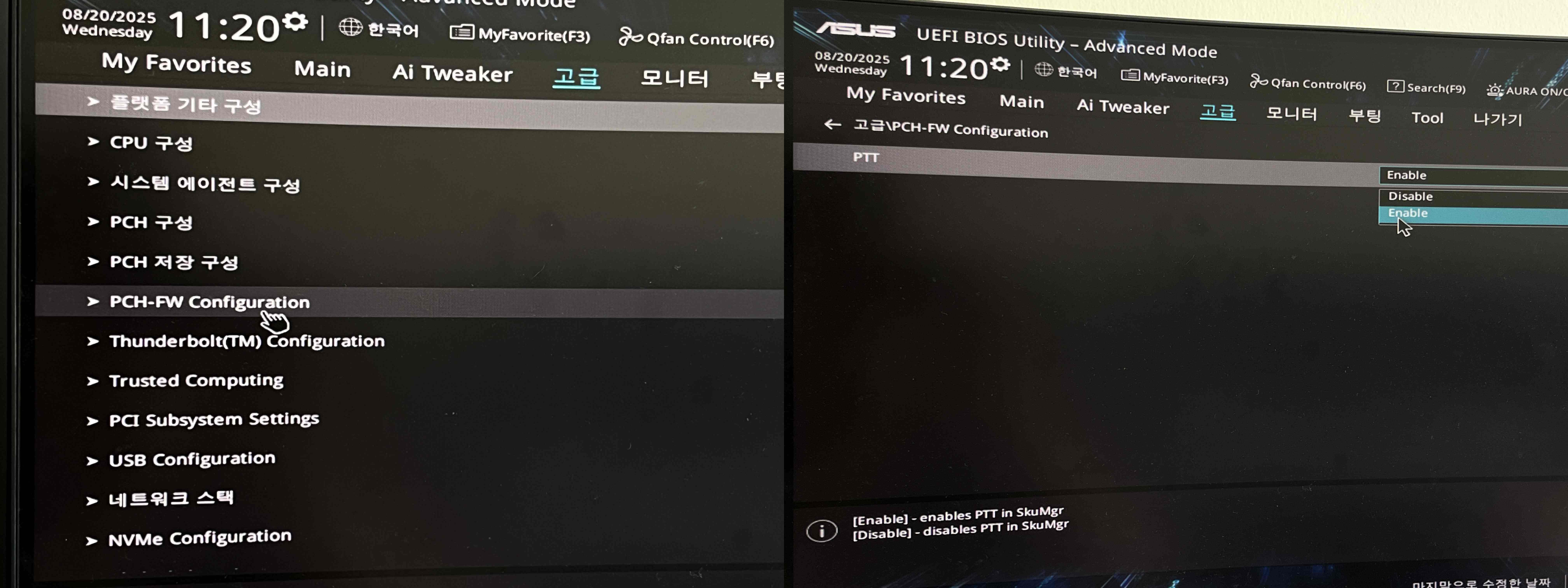 그리고 고급에 들어가면 PCH-FW Confiuration에 들어가고, 거기서 PTT > Enable로 설정하면 된다. 참고로 이건 인텔 CPU를 이용하는 경우다. AMD CPU를 사용하는 사람들은 AMD fTPM Confiuraion > Selects TPM devicde > Enable Firmware TPM으로 바꾸면 된다.