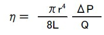 1-1. 단위 시간당 흐르는 유체의 체적(유량)을 Q, 세관의 직경과 길이를 D(2r), L, 관의 양단에 압력을 P1, P2라고 했을 때, 이 차이는 ΔP라고 할 때, 유량은 압력 구배의 비례하고, 이를 통해 점도를 구함. 이는 '포아즈이유의 법칙'이라 불리며, 물리법칙에 의해 정의하므로 '절대점도법'이라고도 한다.