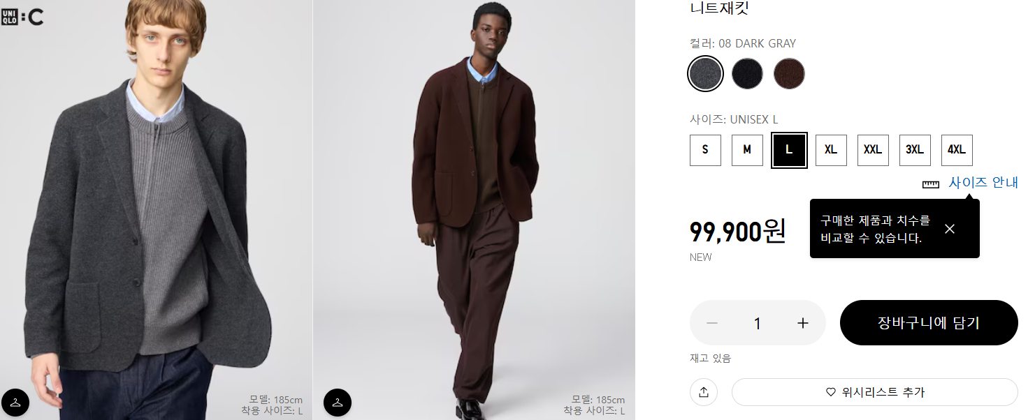 막상 입어보니 안감도 모두 가벼운 니트 재질로 돼있다. 부드러운 편이지만 다소 거칠기도 하다. 축 처지고 넥라인도 깊게 파여서 개인적으로는 불호였다. 단추도 잠그는 것보다 푸는 게 더 낫고 체형을 좀 많이 타게 되는 재킷이었다.