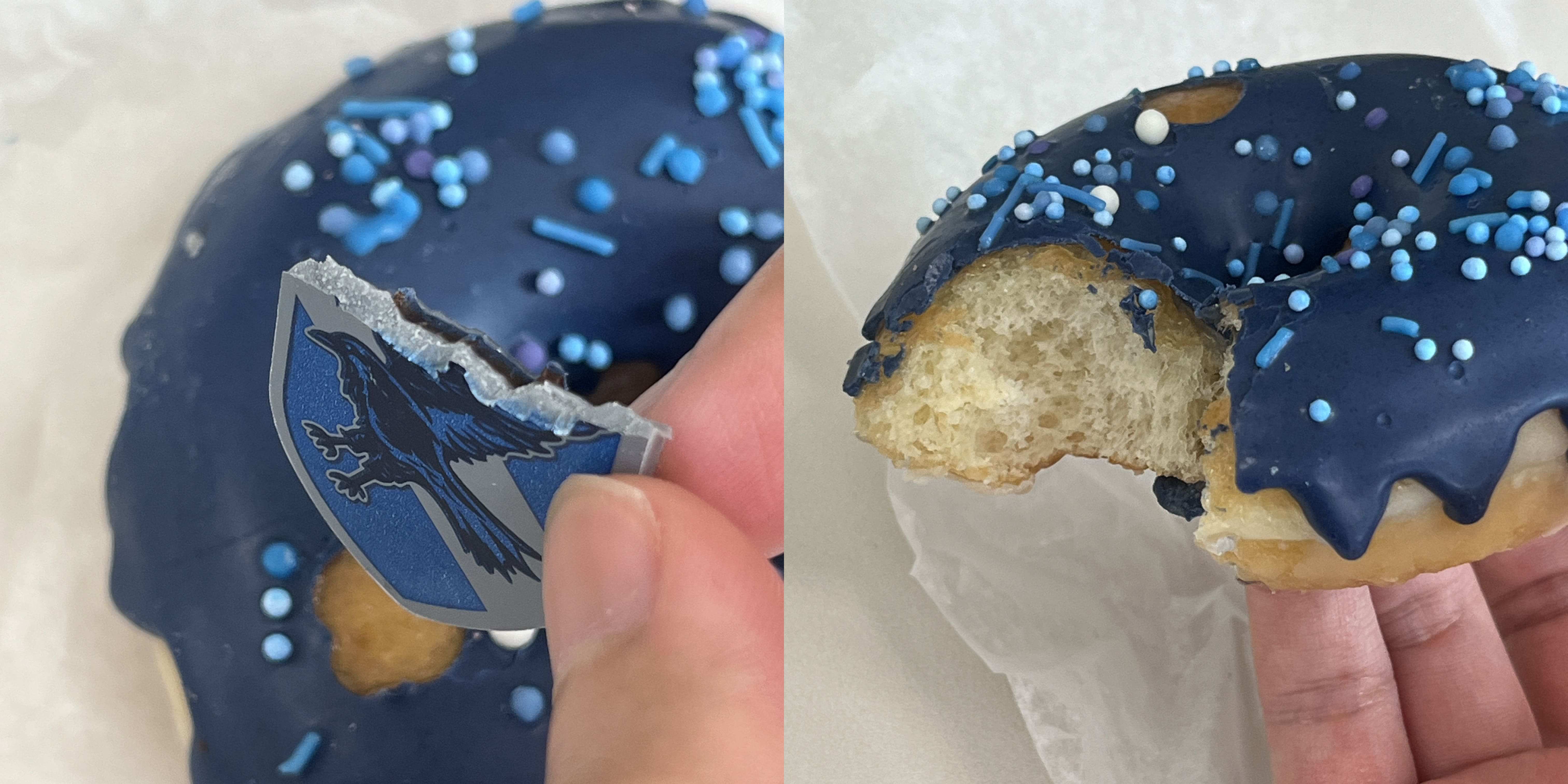 블루베리 아이싱 덕분에 상큼한 향이 나온다. 블루베리 맛이 엄청 강하진 않지만 도넛의 느끼함을 적당히 잡아주는 느낌이라 괜찮았다. 스프링클 때문에 식감도 가끔 재밌다. 색감이 참 예뻤음. 레번클로 마크는 그냥 설탕 초콜릿이다.