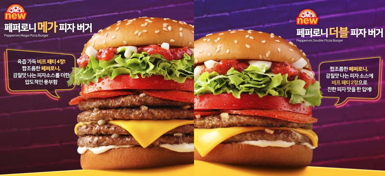 슈비버거와 동일한 틀에 비프패티가 두 장, 치즈 한 장 그리고 큰 페퍼로니 두 장과 피자 소스가 들어간다. 더블은 패티 2장이고, 메가는 패티 4장이다. 가격은 좀 싸지 않은 편이다. 맥런치 할인도 500원이라 좀 살짝 아쉬운 느낌.