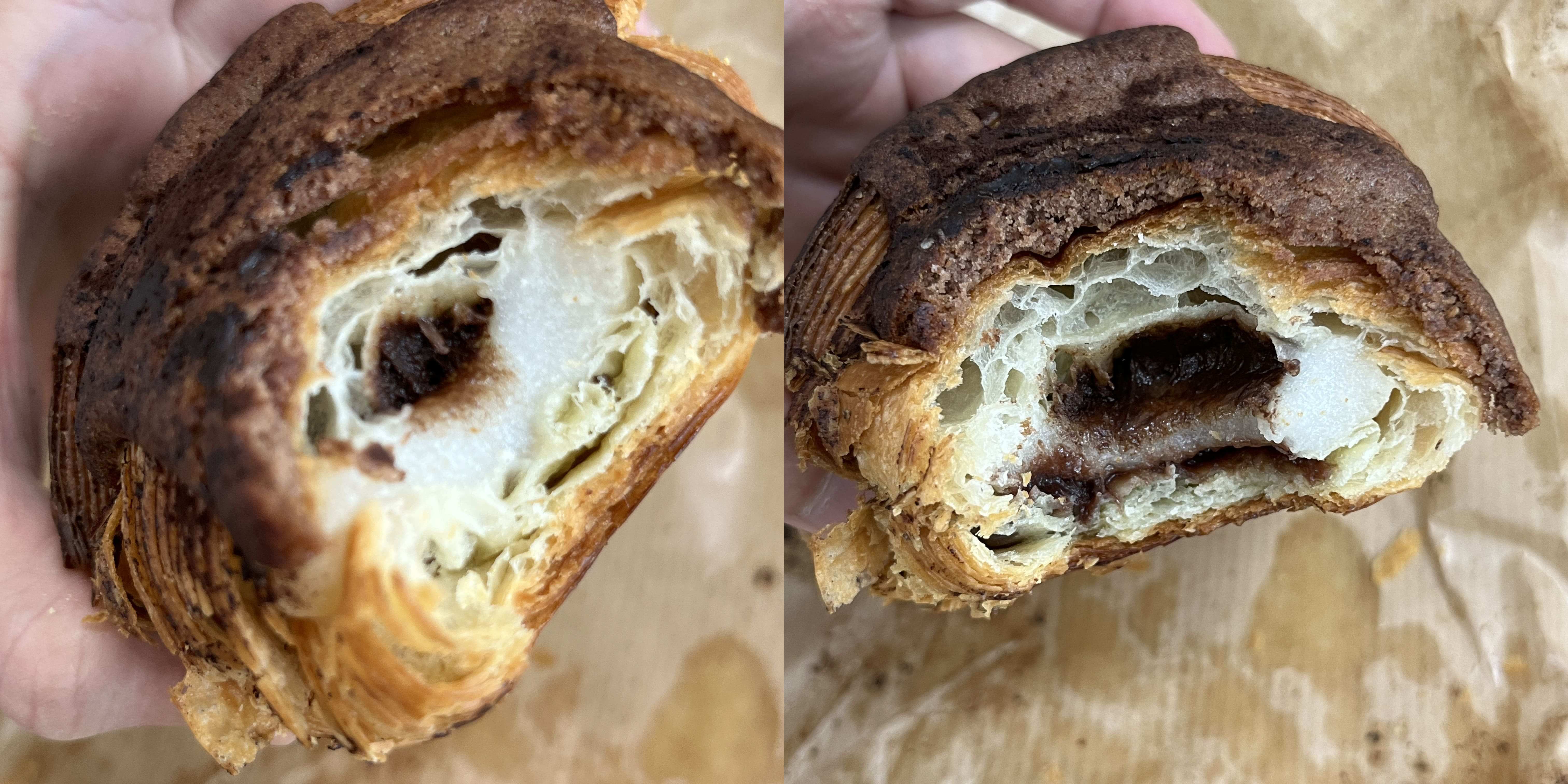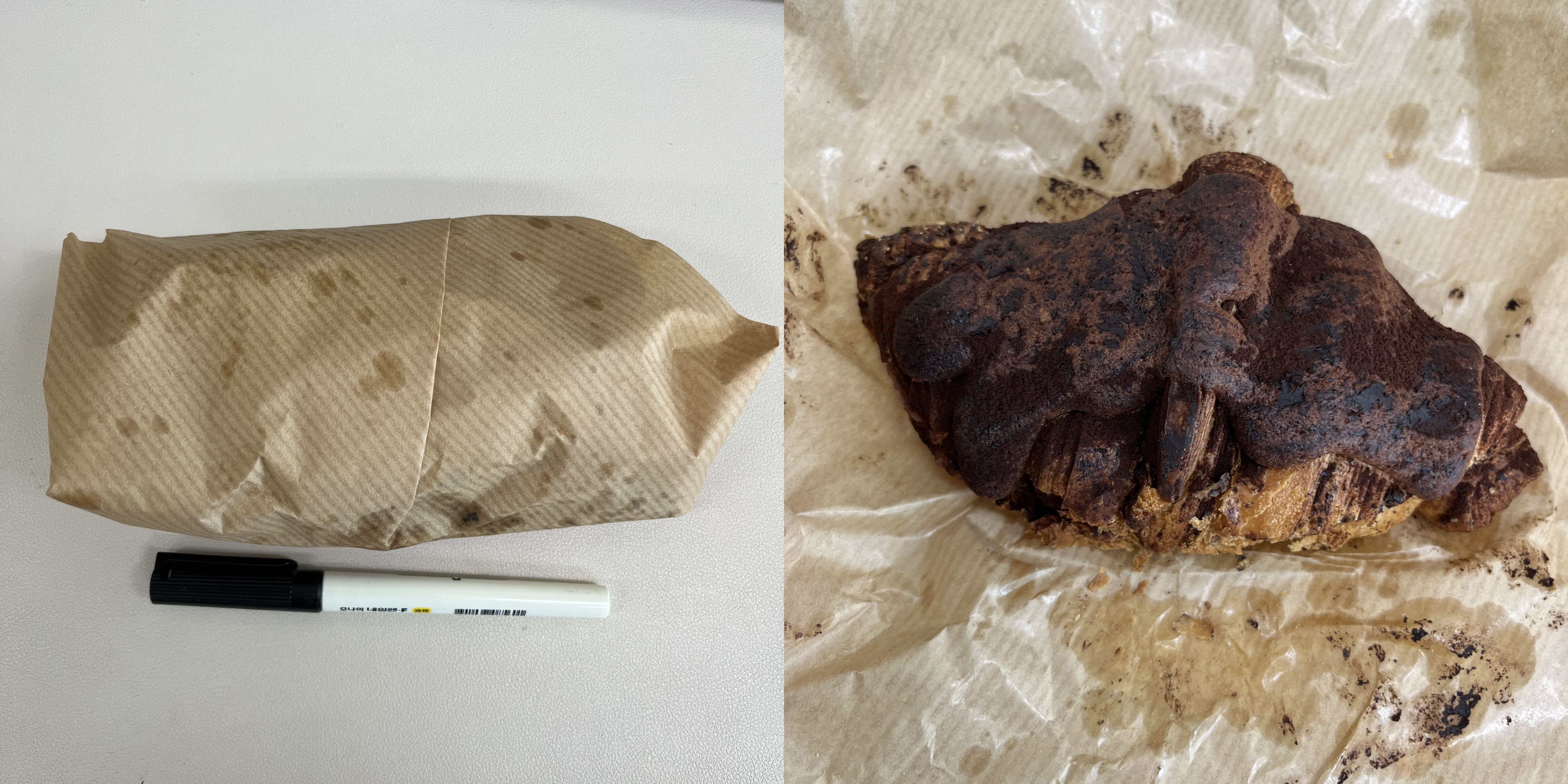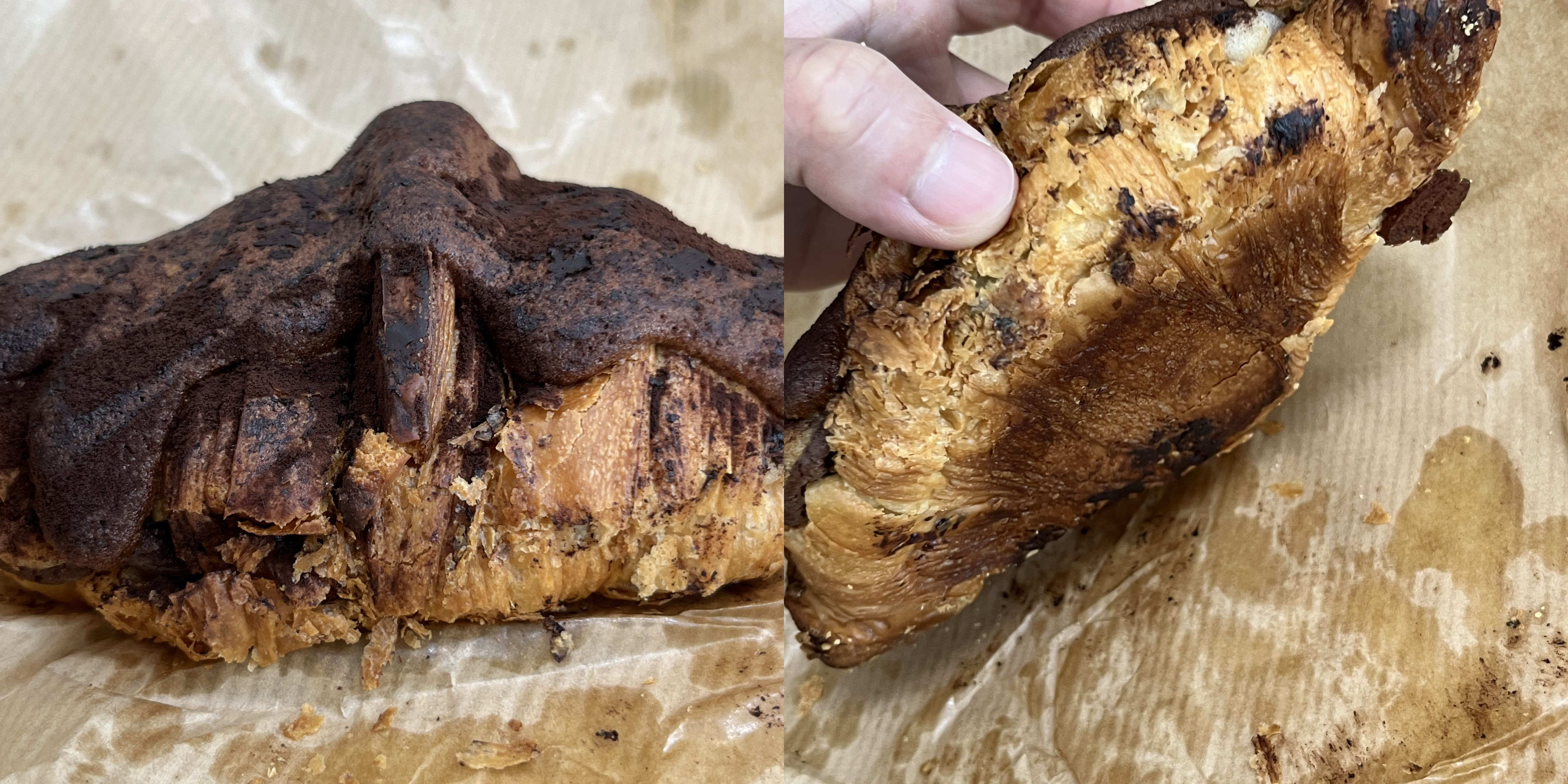 나는 세 가지 맛의 크로찌 중 남아있는 것이 초코와 인절미 크로찌와 초코 크로찌를 먹었다. 3가지 맛 중에 초코크로찌가 양이 가장 많고 남아있었는데 플레인, 인절미, 초코순으로 인기가 있나 보다 싶었다. 크기는 꽤 큼직한 크로와상이다. 그리고 초코파우더가 뿌려져 있다.