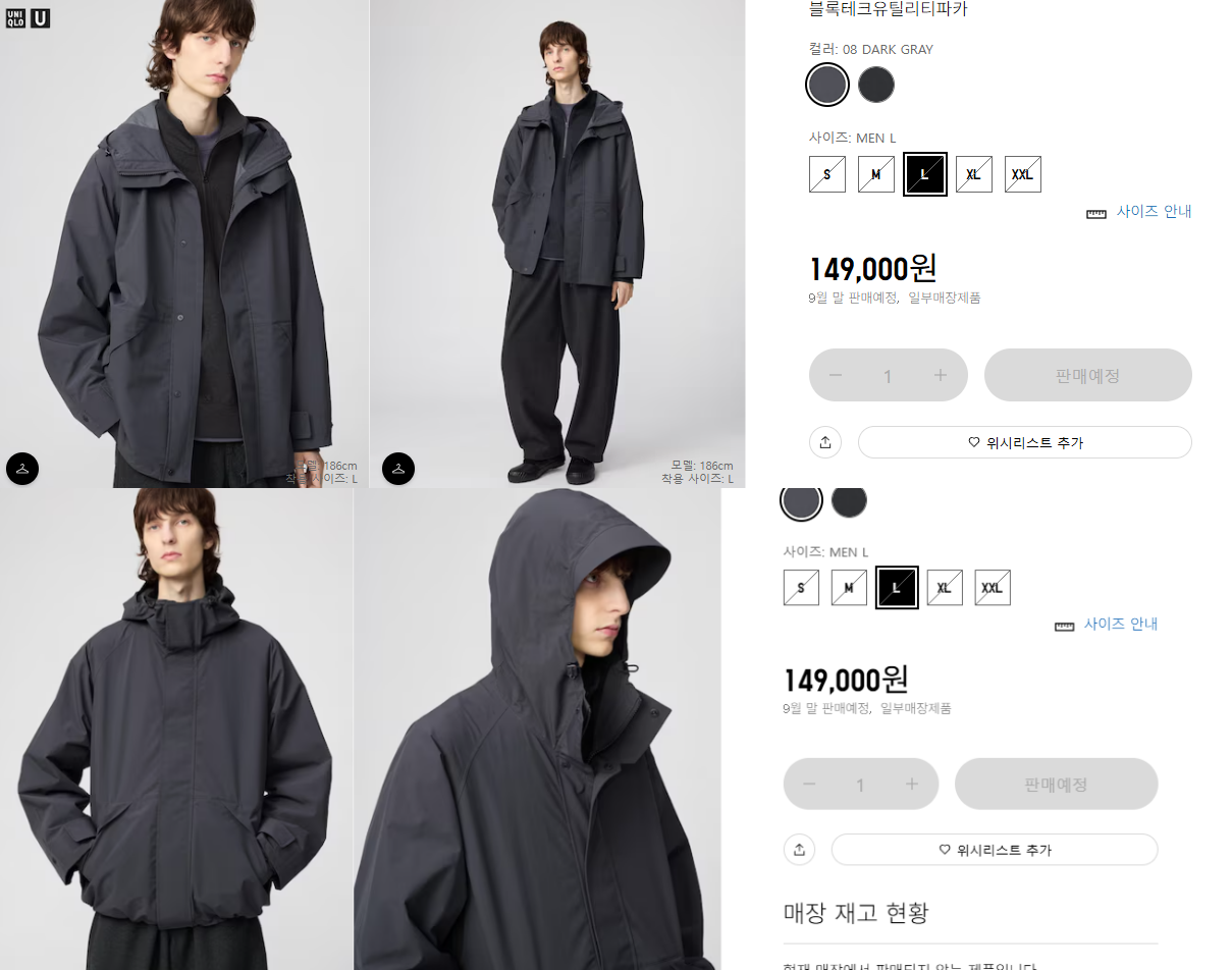 개인적으로는 실물이 궁금한 제품 중에 하나다. 오버사이즈로 나왔고 가격은 149,000원으로 비싼 편이다. 모자는 앞쪽 챙이 있어서 실용성이 좋고, 밑단에는 스트링이 있어 조절이 가능하다. 소매에도 벨크로가 있는 듯