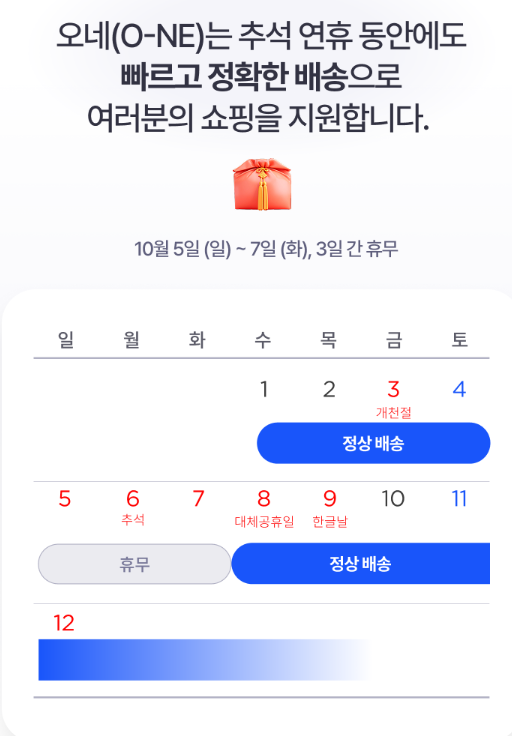 - 10월 3일(개천절)과 4일(토요일), 8일(대체공휴일), 10월 9일(한글날)에는 정상 배송을 진행한다.