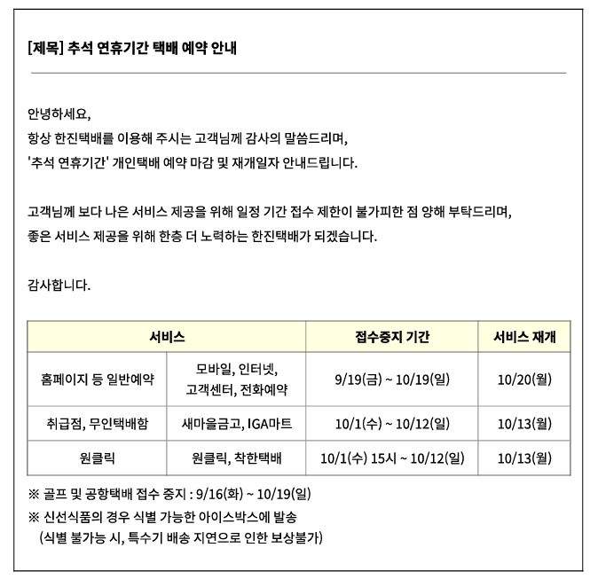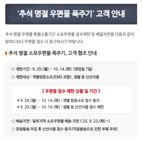 2025년 추석 택배사별 마감 및 휴무일 정리