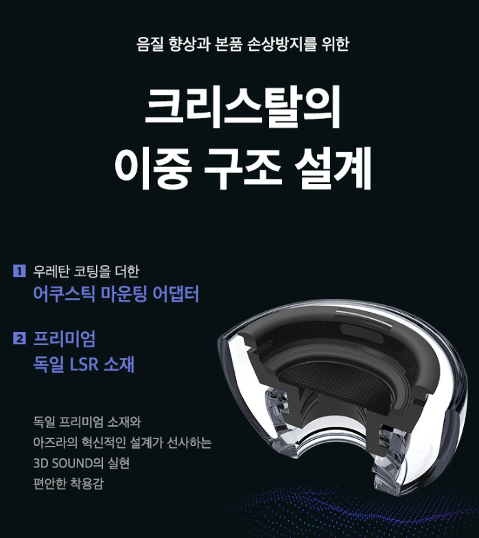 - 설계: 정밀한 설계와 편안함과 고정력, 어댑터 부분은 우레탄 코팅, 이어왁스 가이드(필터)는 이탈리아 브랜드의 고품질 소재 활용