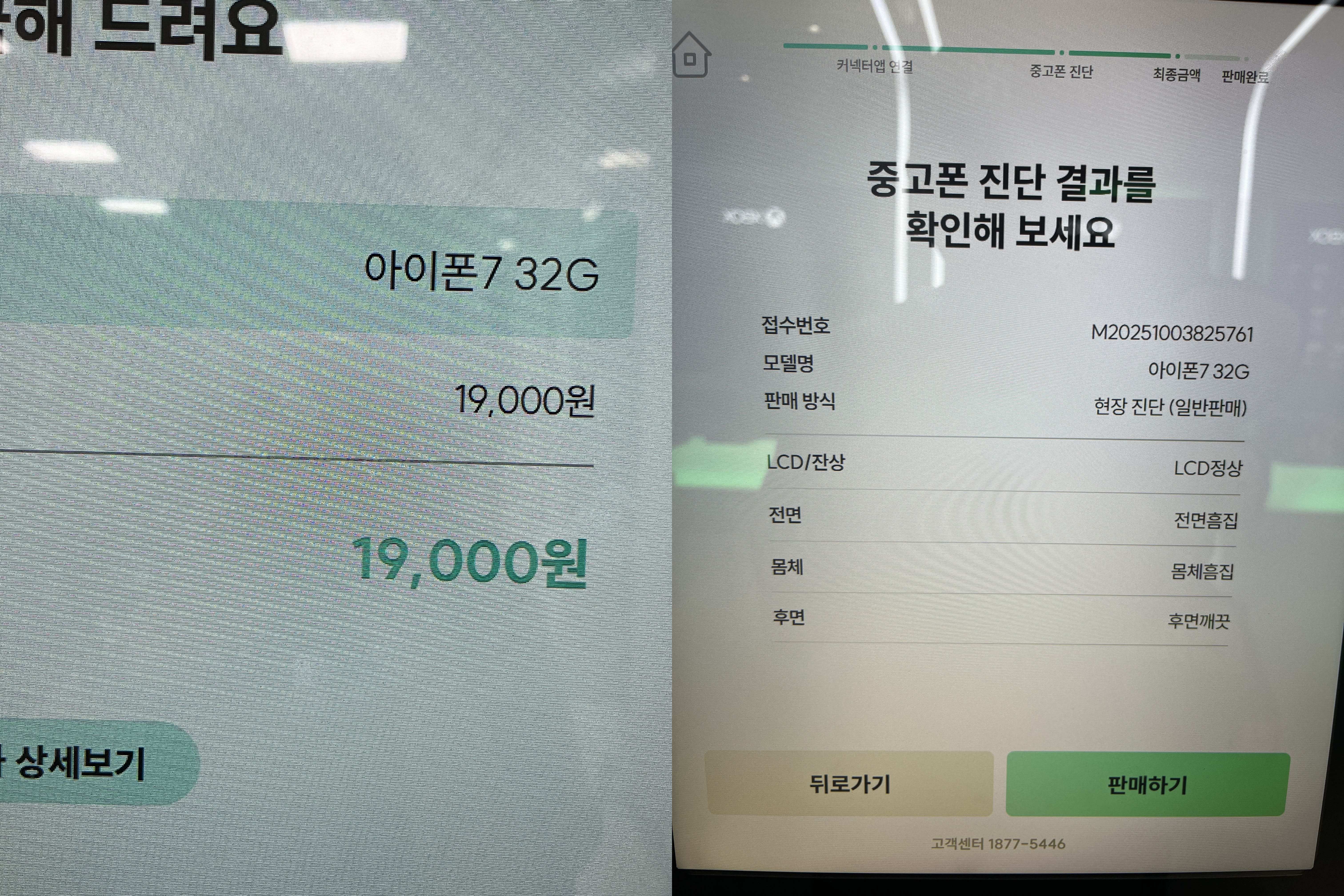 민팃에서는 시세를 볼 수 있는데 확인하니 아이폰7 32기가는 A등급이 54,000원. 나처럼 흠집이 있으면 바로 B등급으로 강등되는데 이때 가격이 19,000원이다. 너무 짜다. 혹시나 해서 다른 민팃 ATM 두 군데에서 추가로 해봤는데 같은 결과였다.