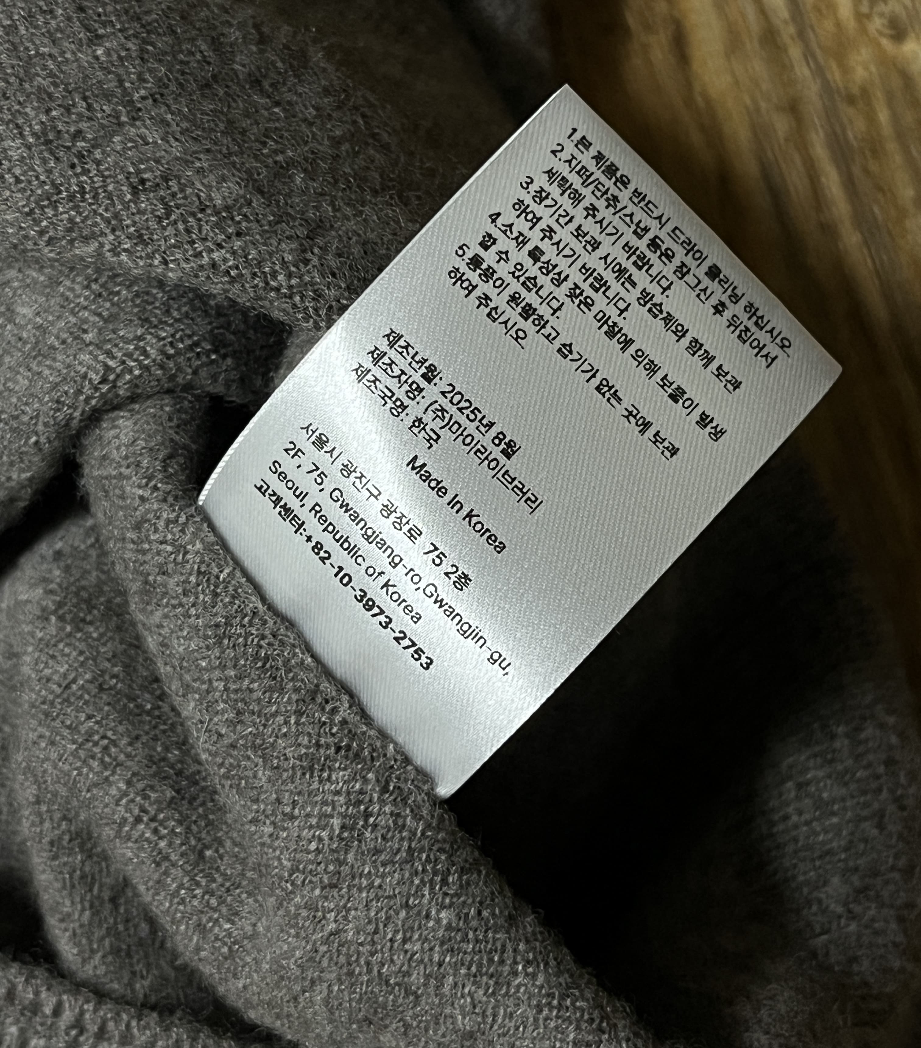 나는 기본 회색 니트가 없는데 너무 정석인 그레이는 싫고 또 그렇다고 짙은 쥐색 같은 그레이는 좀 어둡고 하던 차에 이 제품을 보게 됐다. 약간 갈색빛이 은은하게 도는 회색이라 어떤 옷에도 매치가 되고 잘 입은 느낌이 든다. 이게 실제 색이 담기가 힘든데 마리브 공식 홈페이지에 나온 색이 정확하다.