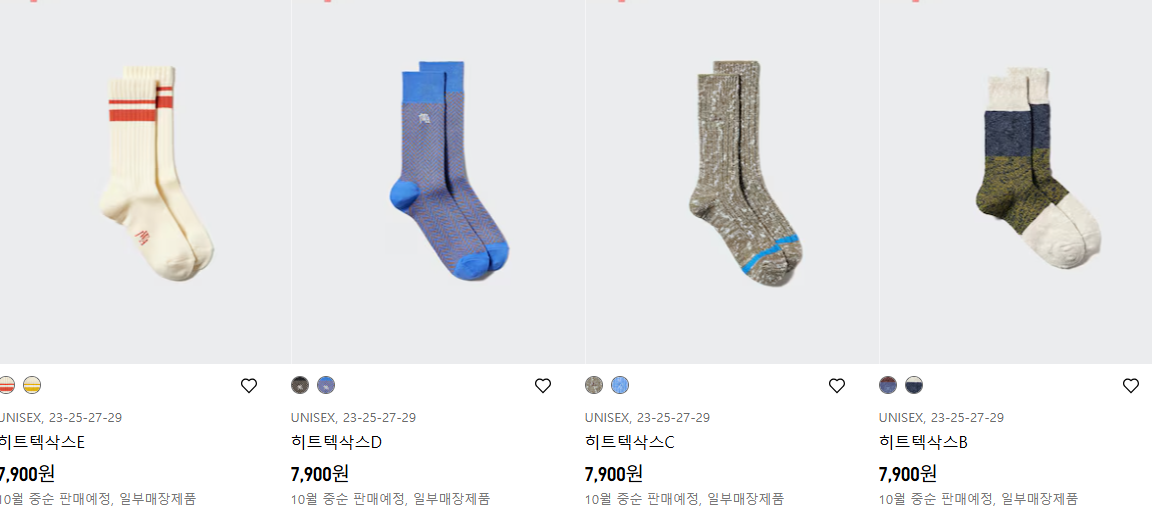 전에도 출시가 된 적이 있는 코듀로이캡과 토트백인데, 토트백은 색감이 예뻐서 많이들 살 것 같다. 그 외 인기가 많던 귀여운 히트텍 삭스들도 잘 팔릴 것 것 같다.