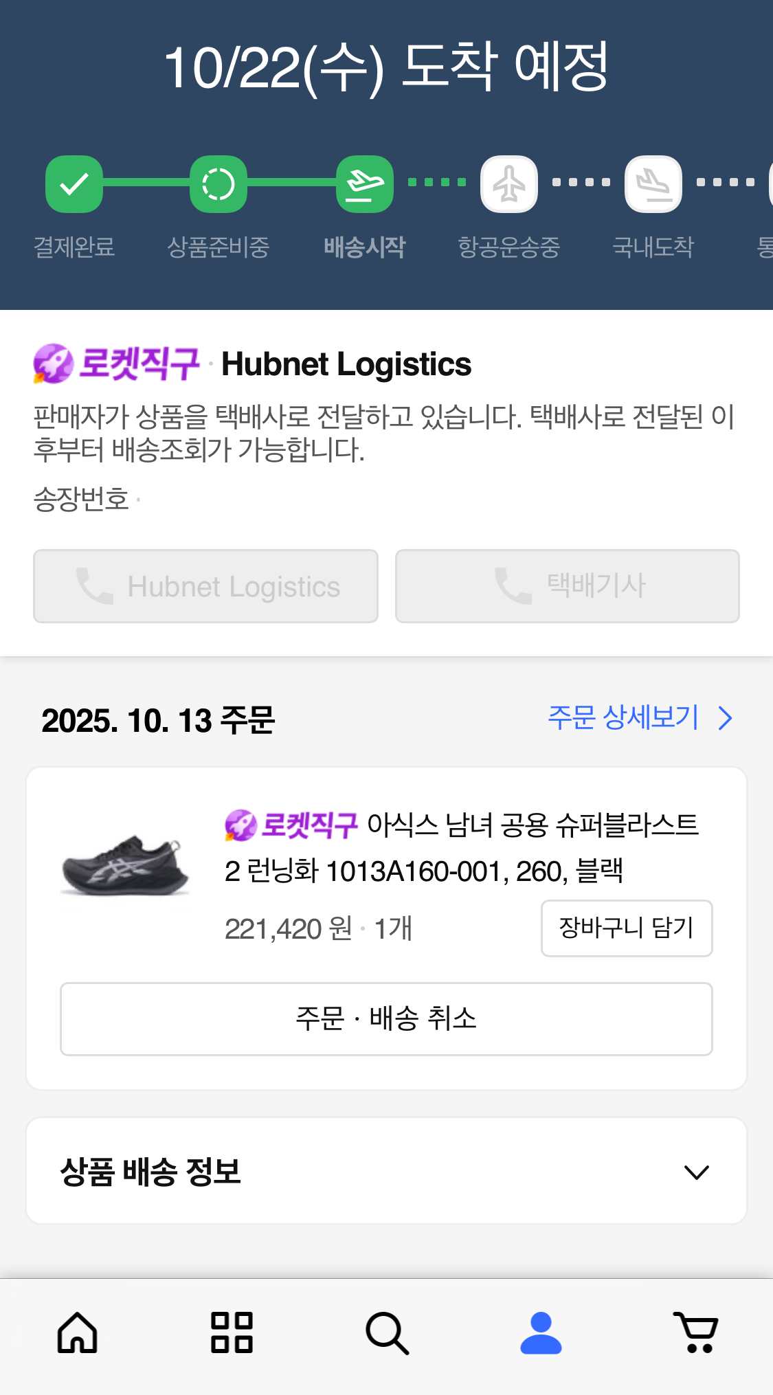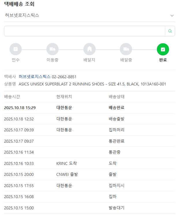 발송이 된 후에 운송장 번호가 뜨긴 뜨는데 쿠팡에서는 조회가 안 됐다. 대신 네이버에서 운송장 번호를 검색하고 회사를 허브넷 로지스틱스로 하면 실시간은 아니지만 어느 정도 결과가 나온다.