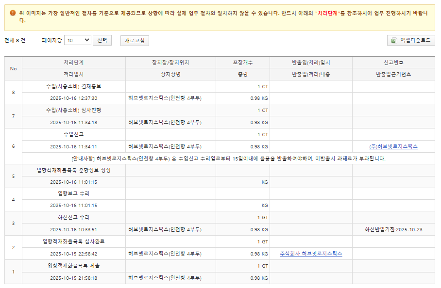 그래서 보니 인천항에 잘 들어와서 반출입 처리 중이었다. 허브넷 로지스틱스가 이 절차가 느리다는 말들이 있었는데 케바케인 것 같기도 하다. 그리고 로켓 직구의 경우는 우선적으로 처리를 해서 빨리 보낸다는 카더라가 있다.