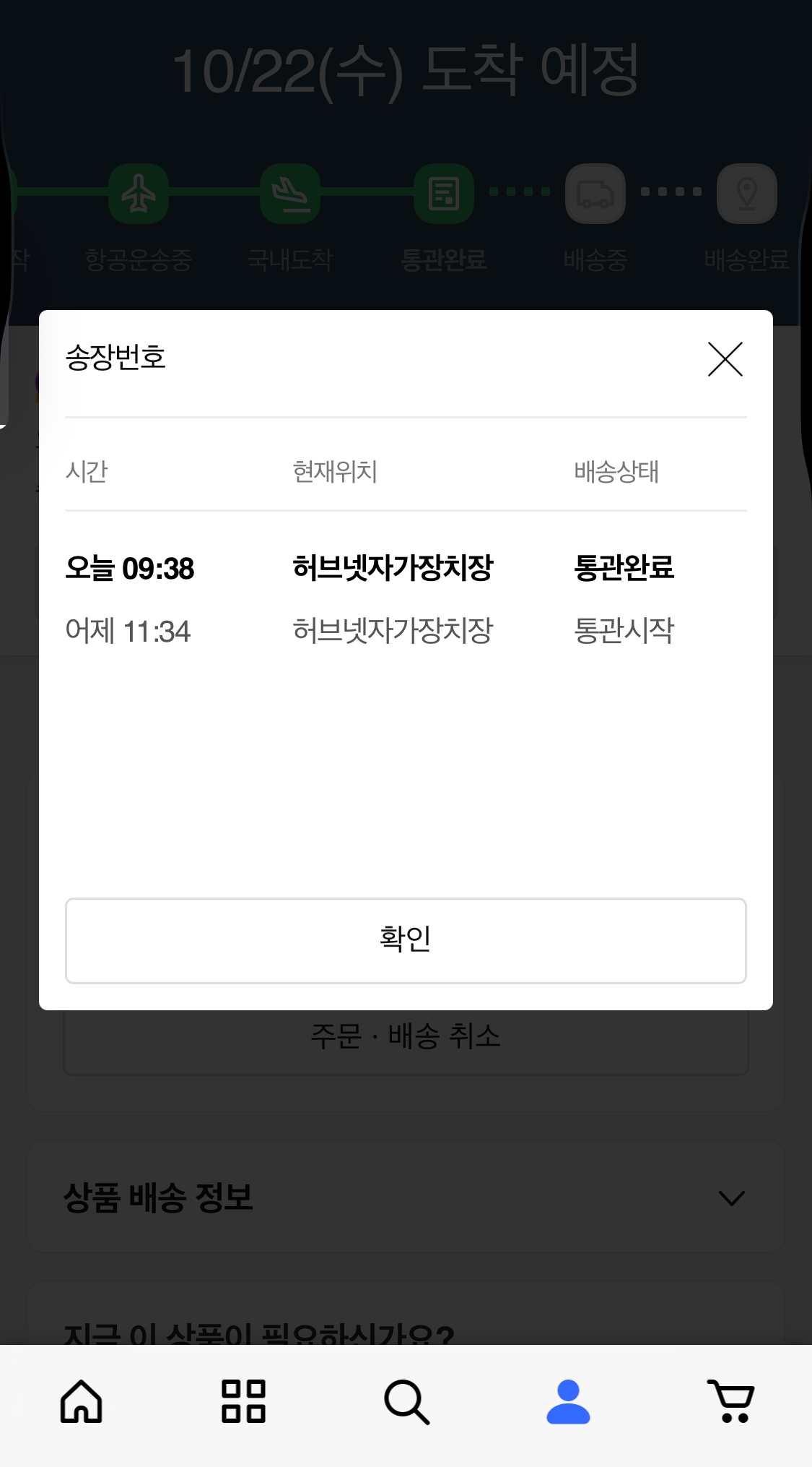 통관이 시작되고 끝나고 나서야 쿠팡에서는 통관시작과 완료 정도만 조회가 가능했다. 그리고 대한통운 오네 앱을 보니 갑자기 아식스 택배 예약이 돼있길래 보니까 통관이 끝나고 나서는 대한통운에 인계하고 배달해 주는 거였다.