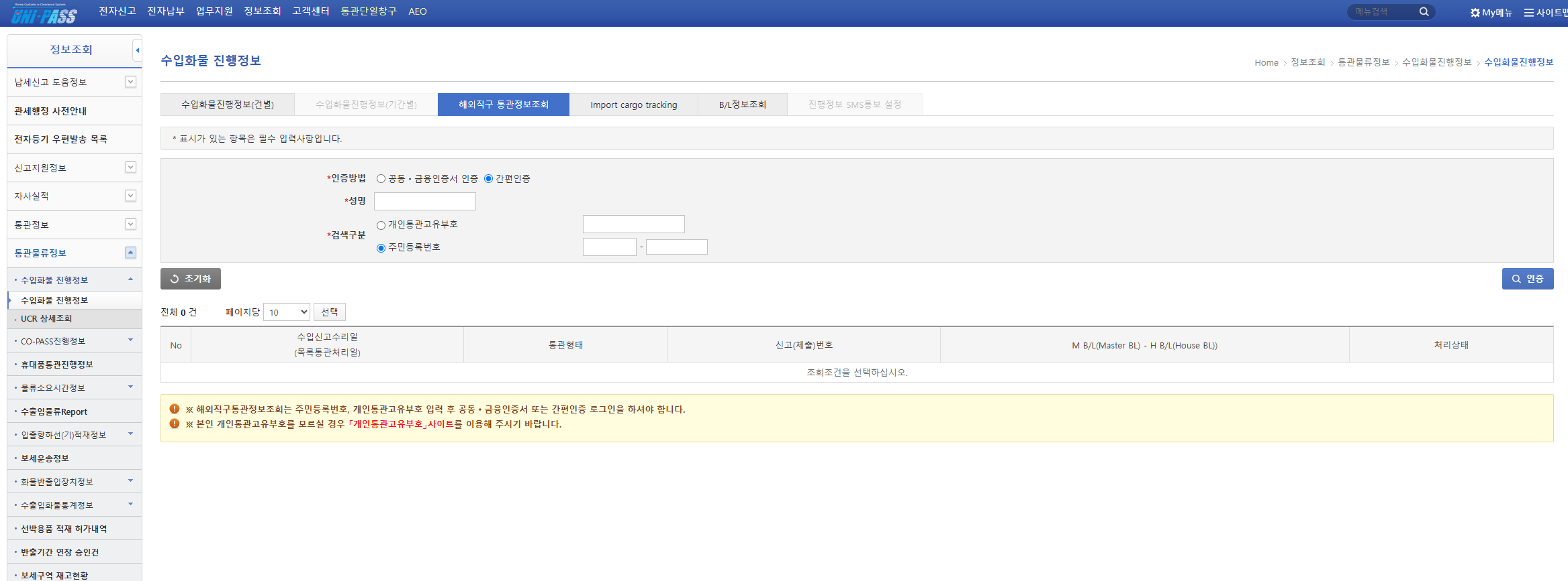 중국에서 오는 허브넷로지스틱스 물류는 항공이 아닌 항만으로 배에 실어서 오는 거였다. 웨이하이 시에 있는 항만에서 인천항까지 간다. 검색을 하니 대략 12시간 이상 걸린다고 해서 16일 아침에 관세청 홈페이진 유니패스에 들어가서 조회를 해봤다.