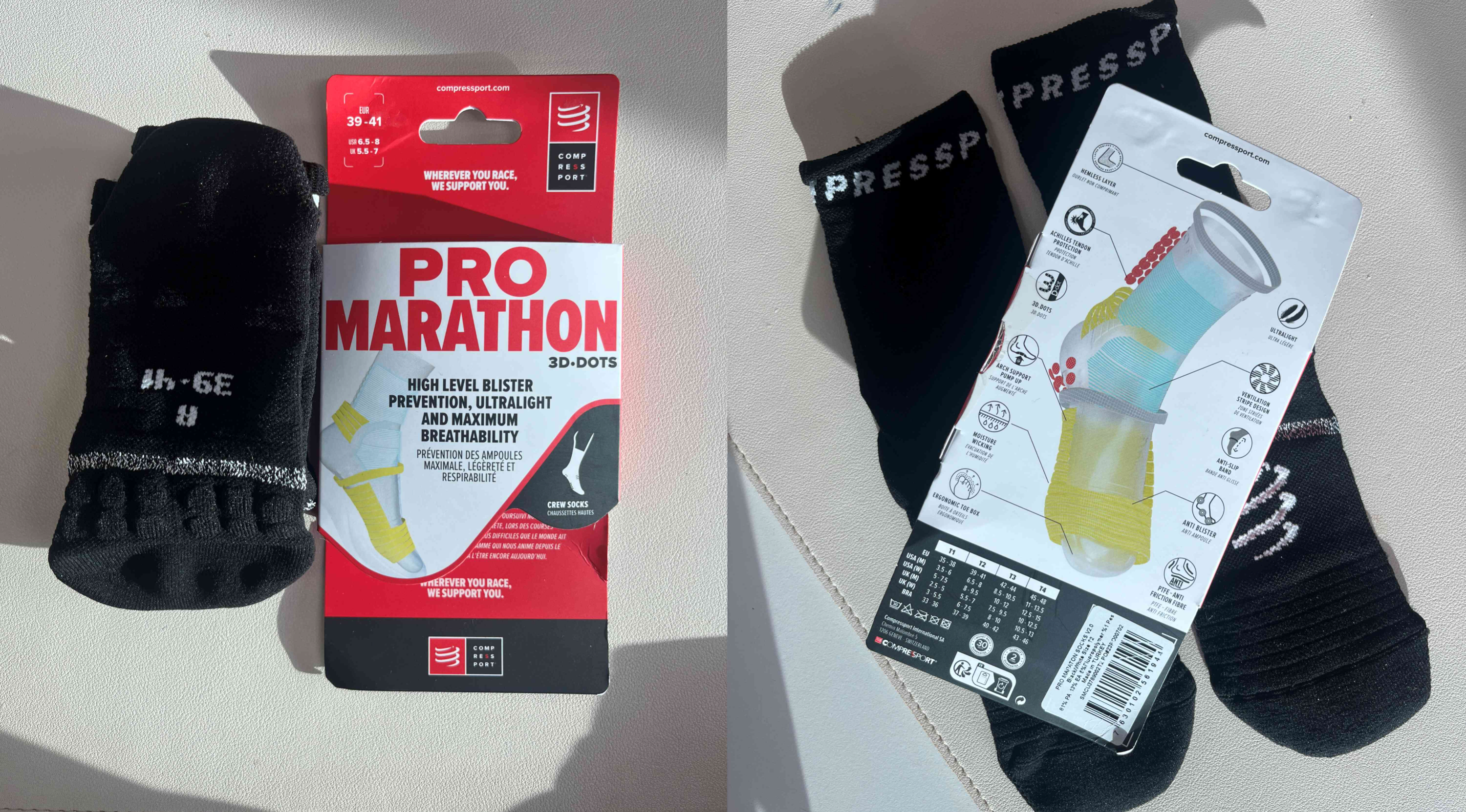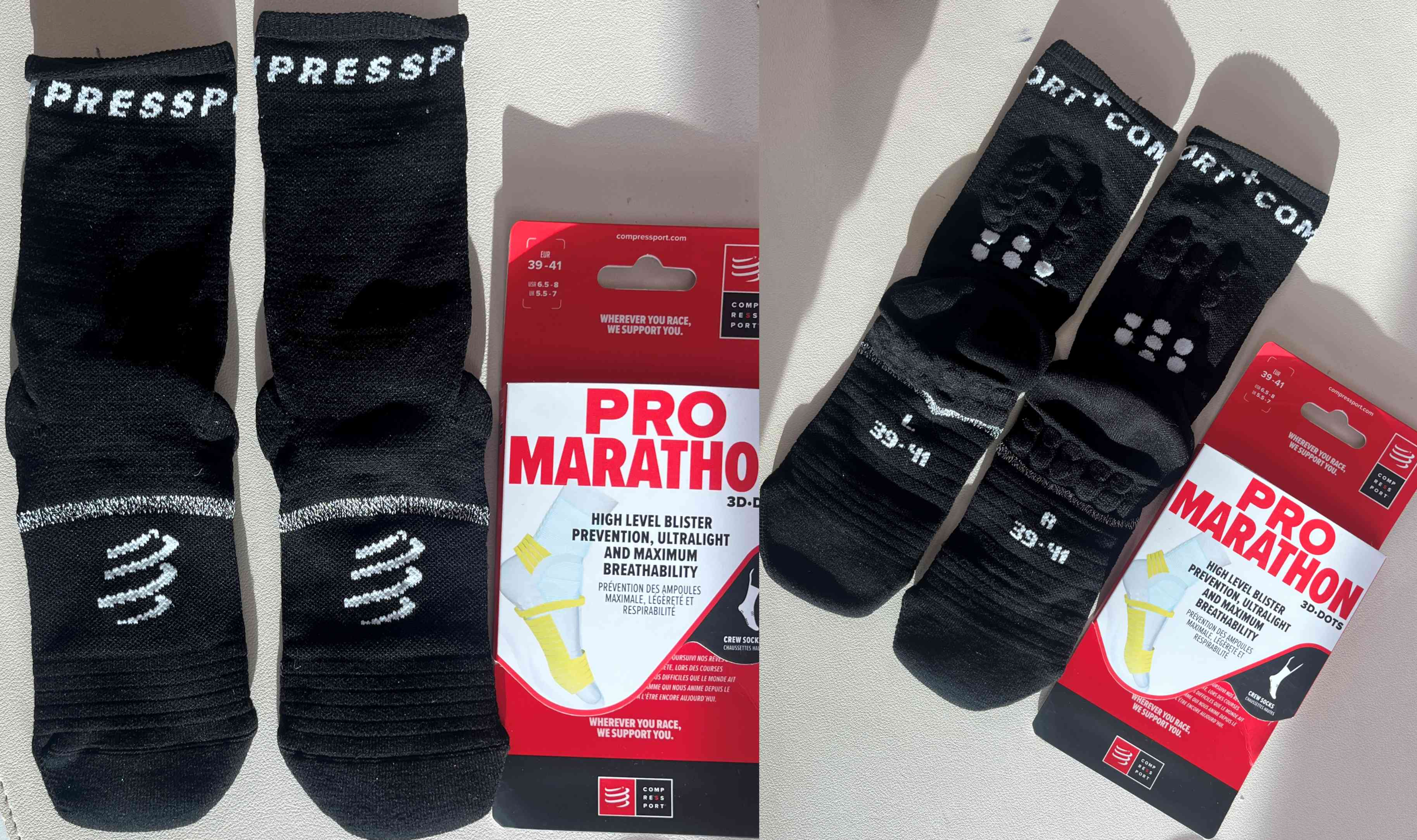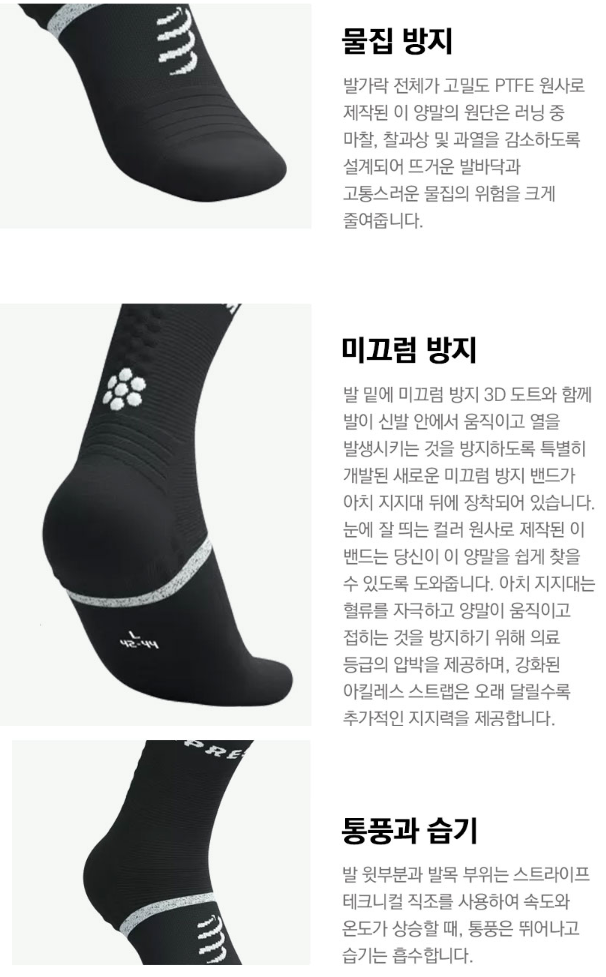 이전에 컴프레스포트의 '프로 레이싱 삭스 V4.0'을 사용한 적이 있다. V4.0 가격은 29,000원이고 프로 마라톤 러닝 양말 V2.0은 33,000원이다. 데카트론 양말이 저렴한 건 2개의 7,900원이기 때문에 한 켤레에 3만 원이 넘는 굉장히 비싼 양말이다.